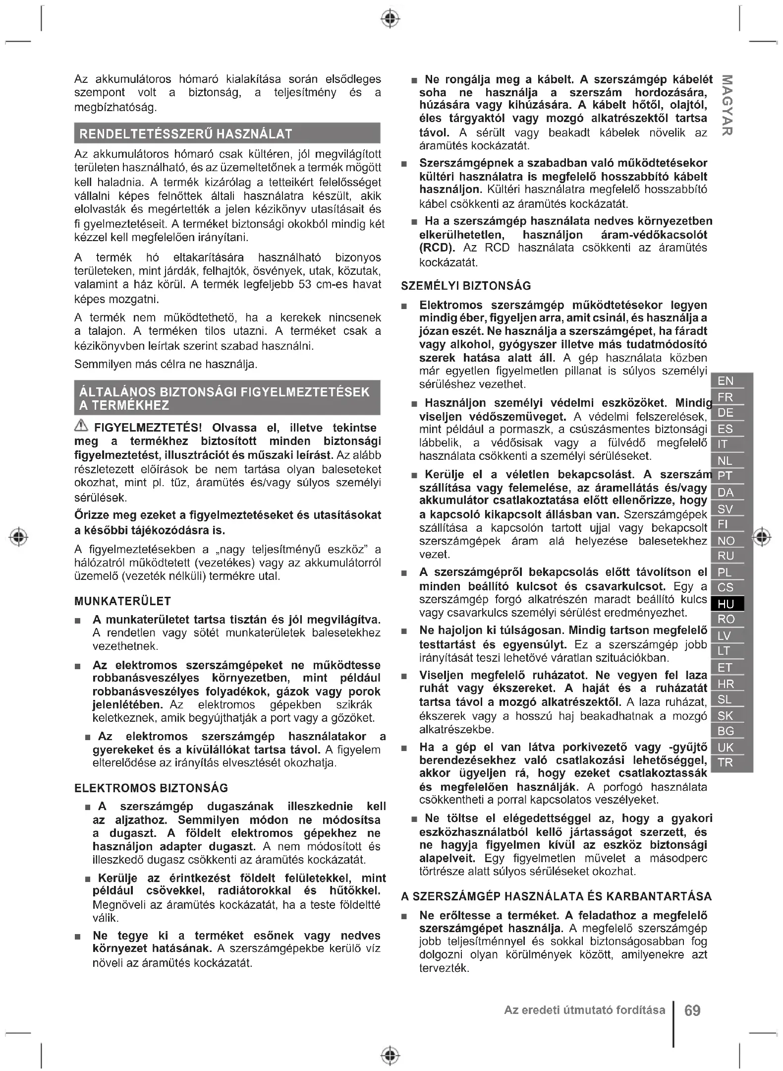 azt a termék hátulja felé. Nem jelent meghibásodást, ha a propeller mechanizmus akadozva mozog. Ellenőrizze, hogy a működés biztonságos a további hóeltakarításhoz.72 Az eredeti útmutató fordítása SZÁLLÍTÁS ÉS TÁROLÁS ■ Tárolás vagy szállítás előtt kapcsolja ki a terméket, vegye ki az akkucsomagot és hagyja kihűlni. ■ Ha a terméket hosszabb ideig szeretné tárolni, mindig olvassa el a kezelési útmutatót a fontos részletekért. ■ Minden idegen anyagtól tisztítsa meg a terméket. Száraz, jól szellőztetett, gyerekektől elzárt helyen tárolja a terméket. A terméket tartsa távol a korrodáló szerektől, például kerti vegyszerektől vagy a jégmentesítő sótól. Ne tárolja a terméket kültéren. ■ Szállításkor rögzítse a terméket elmozdulás és leesés ellen, hogy elkerülje a sérüléseket és a termék sérülését. LÍTIUM AKKUMULÁTOROK SZÁLLÍTÁSA Az akkumulátorokat a helyi és nemzeti előírásokkal és szabályokkal összhangban szállítsa. Az akkumulátorok külső fél általi szállításakor kövesse a csomagolásra és a címkézésre vonatkozó speciális előírásokat. Ügyeljen arra, hogy az akkumulátorok ne érhessenek más akkumulátorokhoz vagy vezető anyagokhoz szállítás közben; ehhez a szabadon maradt csatlakozókat védje szigetelő fedéllel vagy szalaggal. Ne szállítson repedt vagy szivárgó akkumulátorokat. További információért vegye fel a kapcsolatot a továbbítást végző céggel. KARBANTARTÁS ■ Csak a gyártó eredeti cserealkatrészeit, tartozékait és szerelékeit használja. Ennek figyelmen kívül hagyása gyenge motorteljesítményt, esetleges sérülést és a jótállás elvesztését okozhatja. ■ szervizelés különös figyelmet és hozzáértést igényel, és csak szakképzett szerelő végezheti el. A terméket csak engedéllyel rendelkező szervizben javíttassa. ■ Kapcsolja ki és távolítsa el az akkumulátort. A tisztítási és karbantartási műveletek megkezdése előtt győződjön meg arról, hogy minden mozgó alkatrész teljesen megállt. ■ Gyakori időközönként ellenőrizze a csavaranyák, csavarok és fejescsavarok megfelelő meghúzását, hogy a termék biztonságos üzemi állapotban legyen. A sérült alkatrészeket egy hivatalos szervizközpontban kell megjavíttatni vagy kicseréltetni. ■ A sérült vagy olvashatatlan címkék cseréjéhez vigye vissza a terméket egy hivatalos szervizközpontba. ■ A járókerék lefagyásának megakadályozása érdekében járassa párszor a terméket, hogy a járókerék fagyását megakadályozza. ■ A használati útmutatóban leírt beállításokat és javításokat Ön is elvégezheti. Egyéb javítás tekintetében a terméket csak engedéllyel rendelkező szervizben javíttassa. ■ Használat után a műanyag részeket tisztítsa meg puha, száraz ronggyal.