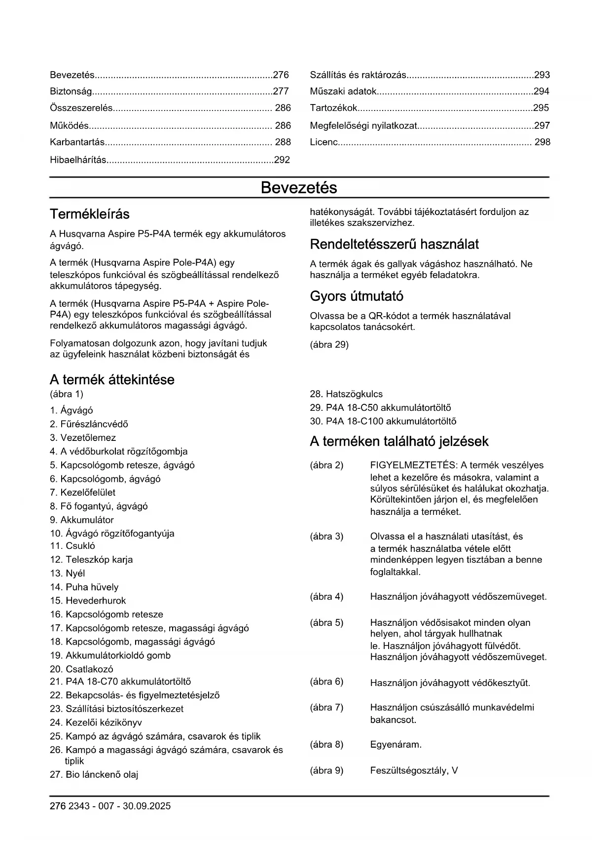 A terméken található jelzések (ábra 2) FIGYELMEZTETÉS: A termék veszélyes lehet a kezelőre és másokra, valamint a súlyos sérülésüket és halálukat okozhatja. Körültekintően járjon el, és megfelelően használja a terméket. (ábra 3) Olvassa el a használati utasítást, és a termék használatba vétele előtt mindenképpen legyen tisztában a benne foglaltakkal. (ábra 4) Használjon jóváhagyott védőszemüveget. (ábra 5) Használjon védősisakot minden olyan helyen, ahol tárgyak hullhatnak le. Használjon jóváhagyott fülvédőt. Használjon jóváhagyott védőszemüveget. (ábra 6) Használjon jóváhagyott védőkesztyűt. (ábra 7) Használjon csúszásálló munkavédelmi bakancsot. (ábra 8) Egyenáram. (ábra 9) Feszültségosztály, V 276 2343 - 007 - 30.09.2025(ábra 10) Óvja a terméket az esőtől. (ábra 11) Láncolajbetöltő. (ábra 12) A fűrészlánc forgásiránya. (ábra 13) Sérülésveszély. Tartsa távol a kezét a fűrészlánctól. (ábra 14) Forgassa balra a gomb meglazításához, és jobbra a megszorításához. (ábra 15) Ez a termék megfelel a vonatkozó EK- irányelveknek. (ábra 16) Az EU irányelveinek és New South Wales „Környezetben történő munkavégzés szabályozása (zajszabályozás), 2017” irányelvének megfelelő környezeti zajkibocsátási címke. A termék garantált hangteljesítményszintjére vonatkozó adatok megtalálhatók a címkén és a következő részben: Műszaki adatok294. oldalon