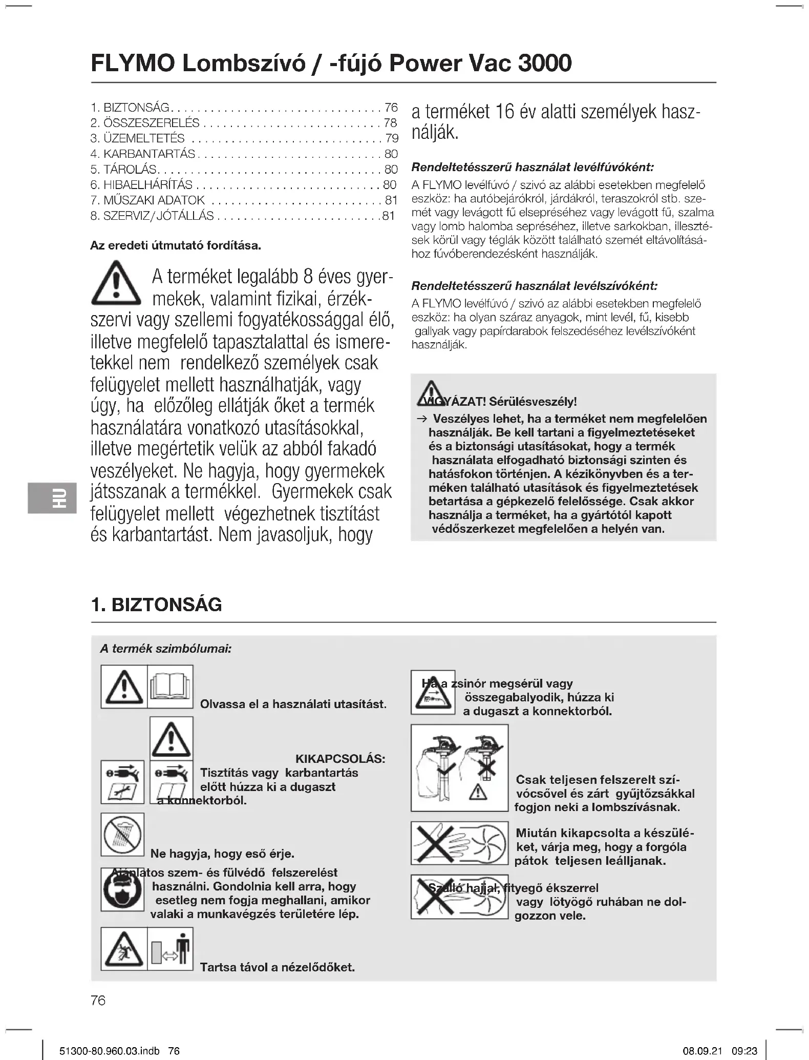 Az eredeti útmutató fordítása. A terméket legalább 8 éves gyer- mekek, valamint fizikai, érzék- szervi vagy szellemi fogyatékossággal élő, illetve megfelelő tapasztalattal és ismere- tekkel nem rendelkező személyek csak felügyelet mellett használhatják, vagy úgy, ha előzőleg ellátják őket a termék használatára vonatkozó utasításokkal, illetve megértetik velük az abból fakadó veszélyeket. Ne hagyja, hogy gyermekek játsszanak a termékkel. Gyermekek csak felügyelet mellett végezhetnek tisztítást és karbantartást. Nem javasoljuk, hogy a terméket 16 év alatti személyek hasz- nálják. Rendeltetésszerű használat levélfúvóként: A FLYMO levélfúvó / szivó az alábbi esetekben megfelelő eszköz: ha autóbejárókról, járdákról, teraszokról stb. sze- mét vagy levágott fű elsepréséhez vagy levágott fű, szalma vagy lomb halomba sepréséhez, illetve sarkokban, illeszté- sek körül vagy téglák között található szemét eltávolításá- hoz fúvóberendezésként használják. Rendeltetésszerű használat levélszívóként: A FLYMO levélfúvó / szivó az alábbi esetekben megfelelő eszköz: ha olyan száraz anyagok, mint levél, fű, kisebb gallyak vagy papírdarabok felszedéséhez levélszívóként használják. VIGYÁZAT! Sérülésveszély! v Veszélyes lehet, ha a terméket nem megfelelően használják. Be kell tartani a figyelmeztetéseket és a biztonsági utasításokat, hogy a termék használata elfogadható biztonsági szinten és hatásfokon történjen. A kézikönyvben és a ter- méken található utasítások és figyelmeztetések betartása a gépkezelő felelőssége. Csak akkor használja a terméket, ha a gyártótól kapott védőszerkezet megfelelően a helyén van.