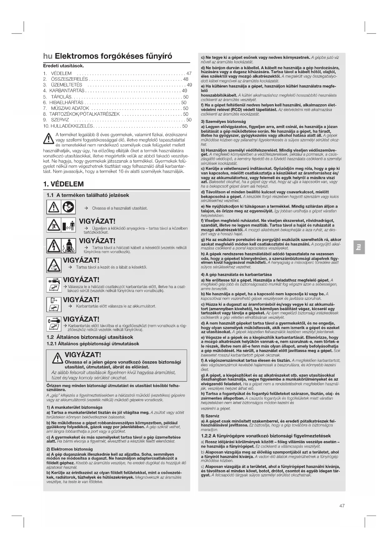 hrhu Elektromos forgókéses fűnyíró Eredeti utasítások. A terméket legalább 8 éves gyermekek, valamint zikai, érzékszervi vagy szellemi fogyatékossággal élő, illetve megfelelő tapasztalattal és ismeretekkel nem rendelkező személyek csak felügyelet mellett használhatják, vagy úgy, ha előzőleg ellátják őket a termék használatára vonatkozó utasításokkal, illetve megértetik velük az abból fakadó veszélye- ket. Ne hagyja, hogy gyermekek játsszanak a termékkel. Gyermekek felü- gyelet nélkül nem végezhetnek tisztítást vagy felhasználó általi karbantar- tást. Nem javasoljuk, hogy a terméket 16 év alatti személyek használják.