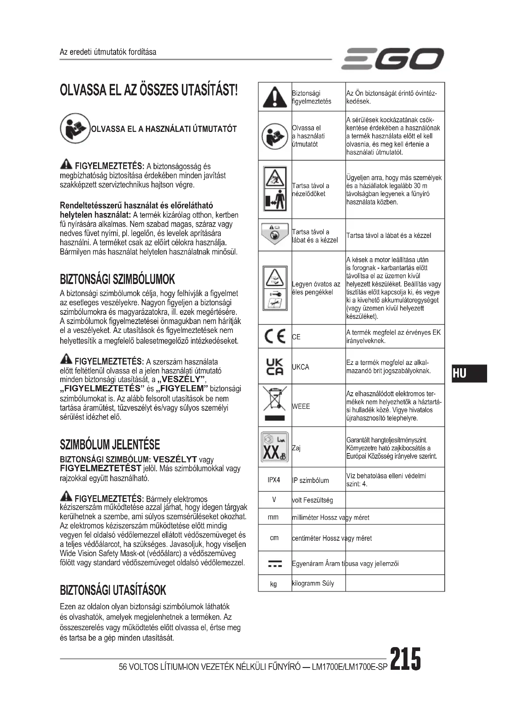 Zaj Garantált hangteljesítményszint. Környezetre ható zajkibocsátás a Európai Közösség irányelve szerint. IPX4 IP szimbólumVíz behatolása elleni védelmi szint: 4. volt Feszültség milliméter Hossz vagy méret centiméter Hossz vagy méretEgyenáram Áram típusa vagy jellemzői kilogramm SúlyAz eredeti útmutatók fordítása56 VOLTOS LÍTIUM-ION VEZETÉK NÉLKÜLI FŰNYÍRÓ — LM1700E/LM1700E-SP216