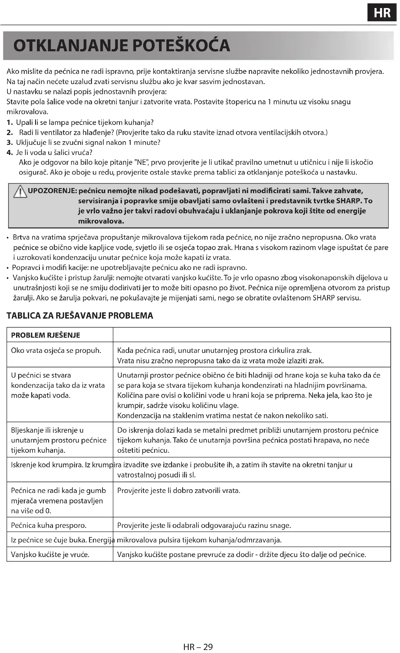 dugva és a biztosíték nem égett ki. Ha mindent rendben talál, ellenőrizze a készüléket az alábbi hibakeresési táblázat alapján. FIGYELMEZTETÉS: Tilos a sütőt a felhasználónak magának módosítania, illetve javítania! A SHARP képzett szakemberén kívül bárki más számára veszélyes bármilyen szervizelést, vagy javítást eszközölni a készüléken. Tartsa be ezt az utasítást, mivel a mikrohullámú energia ellen védő borítások eltávolításával járhat a szerelés.