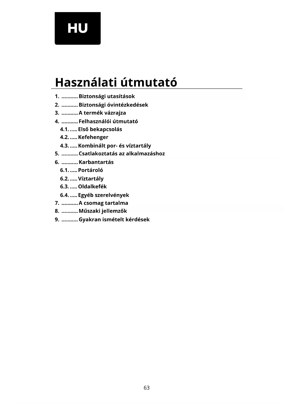 4.1. ..... Első bekapcsolás 4.2. ..... Kefehenger 4.3. ..... Kombinált por- és víztartály