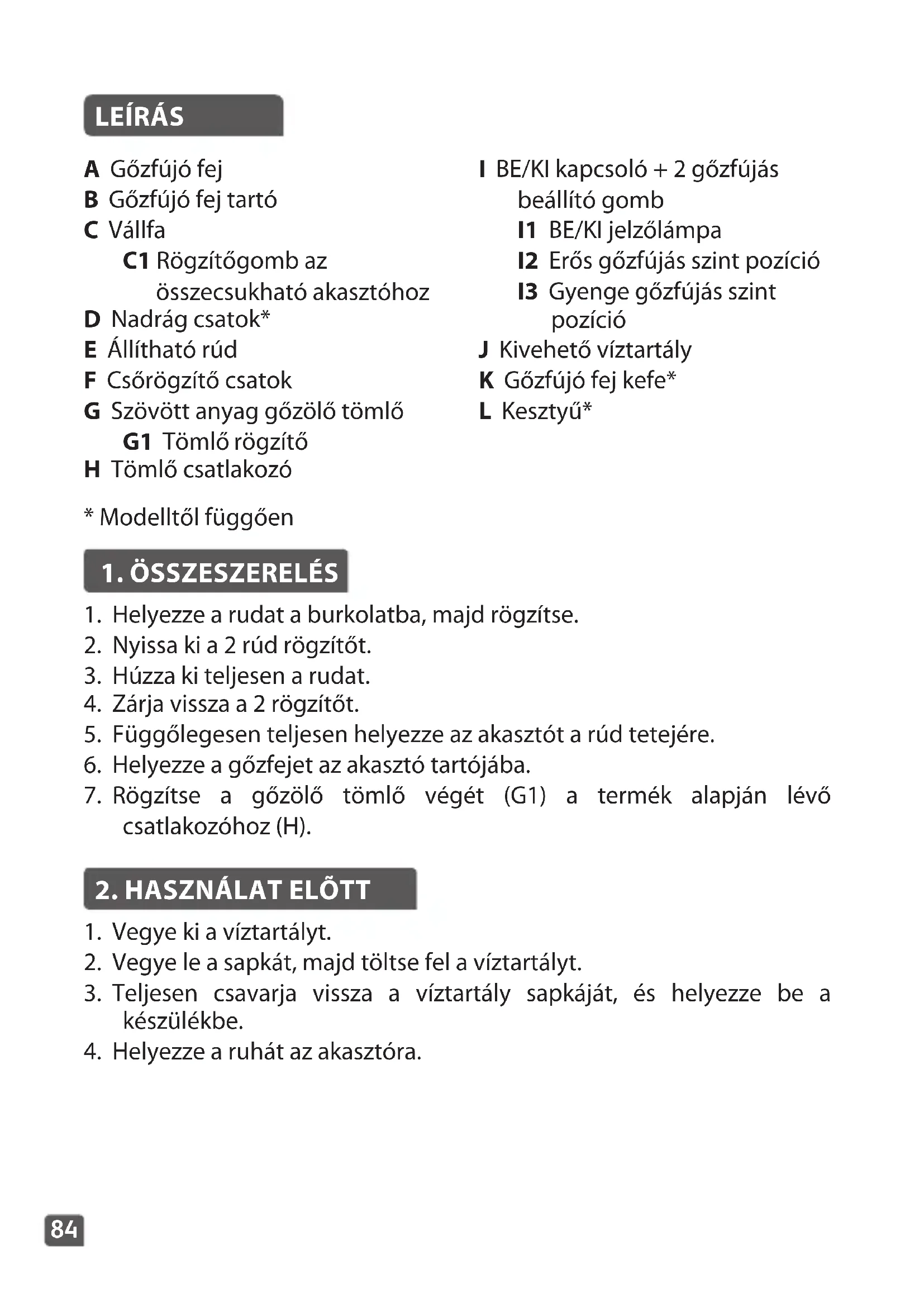 A Gőzfújó fej B Gőzfújó fej tartó C Vállfa C1 Rögzítőgomb az összecsukható akasztóhoz D Nadrág csatok* E Állítható rúd F Csőrögzítő csatok G Szövött anyag gőzölő tömlő G1 Tömlő rögzítő H Tömlő csatlakozó I BE/KI kapcsoló + 2 gőzfújás beállító gomb I1 BE/KI jelzőlámpa I2 Erős gőzfújás szint pozíció I3 Gyenge gőzfújás szint pozíció J Kivehető víztartály K Gőzfújó fej kefe* L Kesztyű*