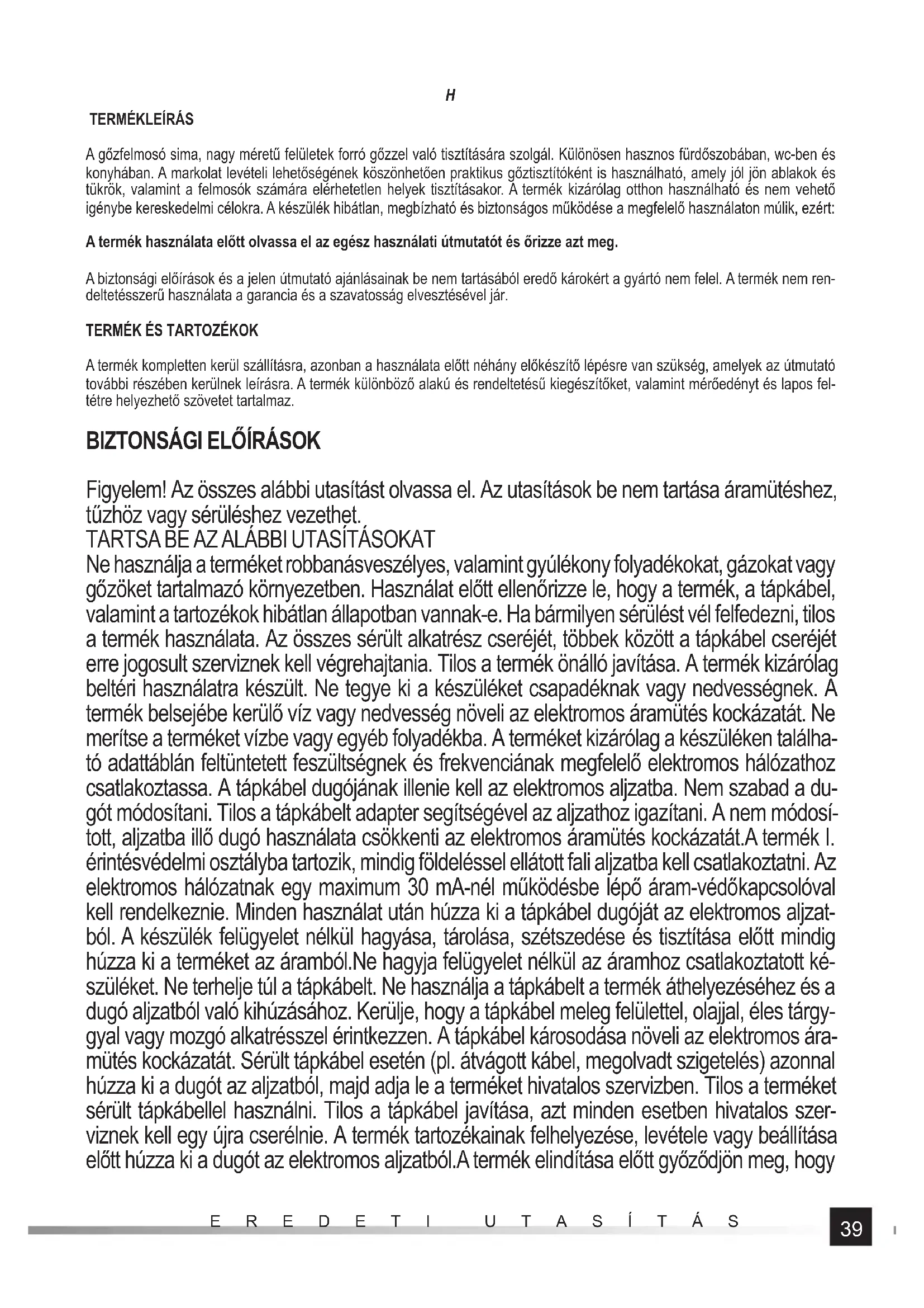 A gőzfelmosó sima, nagy méretű felületek forró gőzzel való tisztítására szolgál. Különösen hasznos fürdőszobában, wc-ben és konyhában. A markolat levételi lehetőségének köszönhetően praktikus gőztisztítóként is használható, amely jól jön ablakok és tükrök, valamint a felmosók számára elérhetetlen helyek tisztításakor. A termék kizárólag otthon használható és nem vehető igénybe kereskedelmi célokra. A készülék hibátlan, megbízható és biztonságos működése a megfelelő használaton múlik, ezért: A termék használata előtt olvassa el az egész használati útmutatót és őrizze azt meg. A biztonsági előírások és a jelen útmutató ajánlásainak be nem tartásából eredő károkért a gyártó nem felel. A termék nem ren- deltetésszerű használata a garancia és a szavatosság elvesztésével jár.
