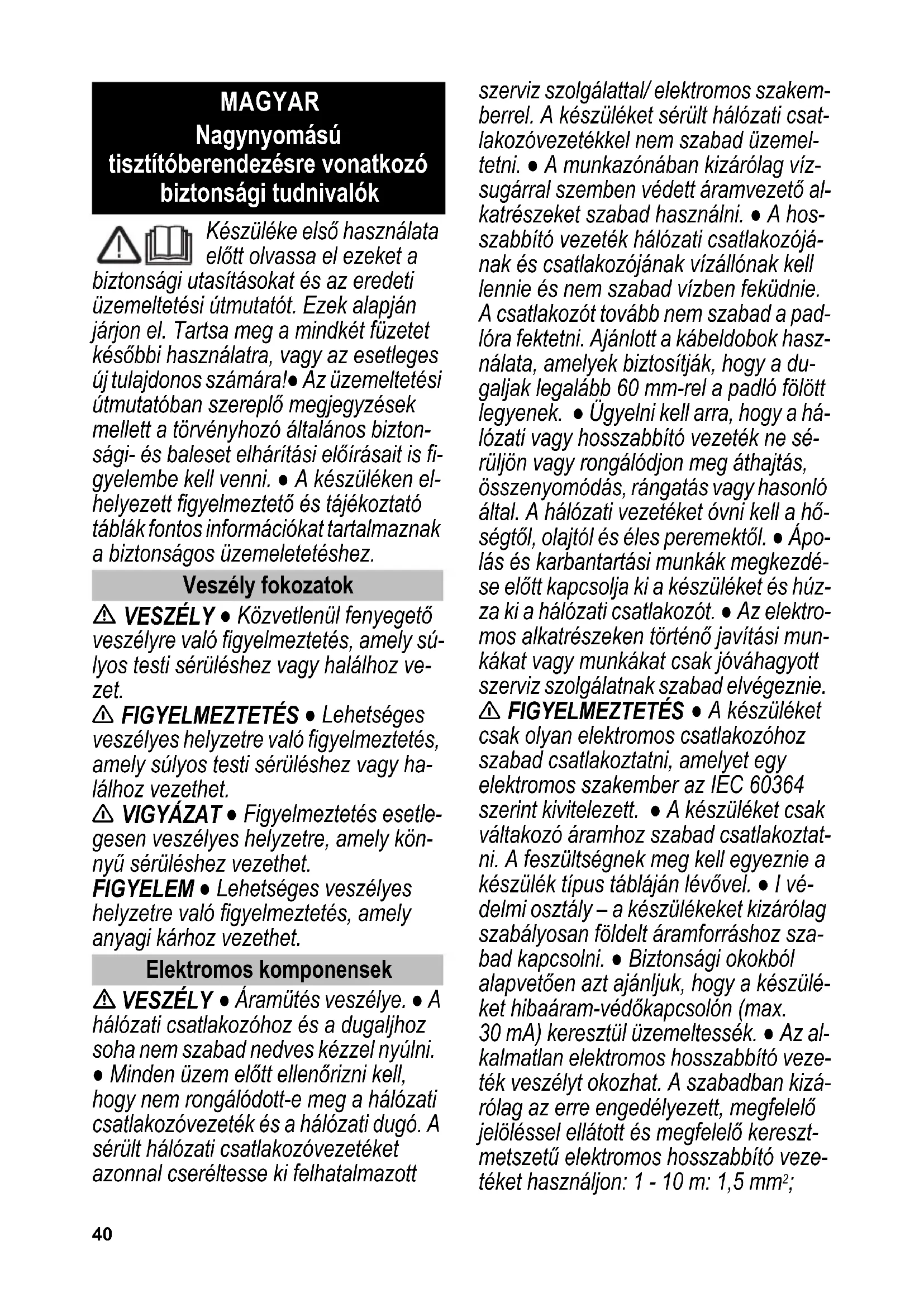MAGYAR Nagynyomású tisztítóberendezésre vonatkozó biztonsági tudnivalók Veszély fokozatok Elektromos komponensek41