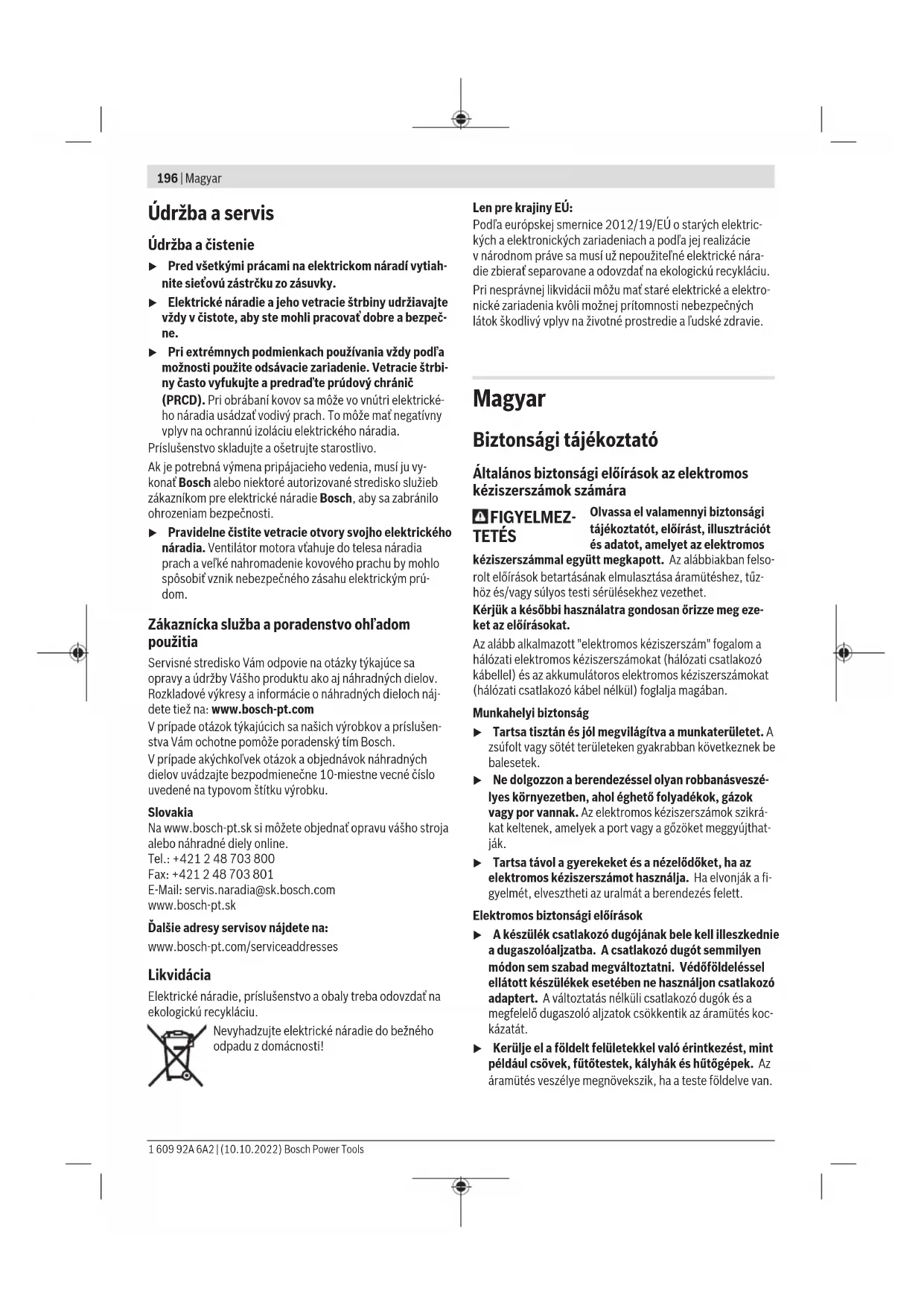 125 6 10 X-LOCK >0 11500 80 A hajtóműfej elfordítása (lásd aEábrát) u Az elektromos kéziszerszámon végzendő bármely munka megkezdése előtt húzza ki a csatlakozó dugót a dugaszolóaljzatból. A hajtóműfejet 90°-os lépésekben el lehet forgatni. Így a be-/ kikapcsolót különleges munkavégzési esetekhez, például balkezes kezelők számára, egy előnyösebb helyzetbe lehet hozni. Csavarja teljesen ki a 4 csavart(➊). Óvatosan, és anélkül, hogy levenné a házról, forgassa el az új helyzetbe(➋) a haj- tóműfejet. Húzza meg ismét szorosra a 4 csavart(➌). A porszűrő leszerelése (lásd aF ésG ábrát) Tolja le az elektromos kéziszerszám alsó oldalán a nyíl által jelzett irányban a(5)porszűrőt,. Ne fogja meg oldalról és ne húzza így le a(5)porszűrőt. Por- és forgácselszívás Az ólomtartalmú festékrétegek, egyes fafajták, ásványok és fémek pora egészségkárosító hatású lehet. A poroknak a ke- zelő vagy a közelben tartózkodó személyek által történő megérintése vagy belégzése allergikus reakciókat és/vagy a légutak megbetegedését vonhatja maga után. Bosch Power Tools 1 609 92A 6A2 | (10.10.2022)206 | Magyar Egyes faporok, például tölgy- és bükkfaporok rákkeltő hatá- súak, főleg ha a faanyag kezeléséhez más anyagokat is fel- használtak (kromát, favédő vegyszerek). A készülékkel az- besztet tartalmazó anyagokat csak szakembereknek szabad megmunkálniuk. – A lehetőségek szerint használjon az anyagnak megfelelő porelszívást. – Gondoskodjon a munkahely jó szellőztetéséről. – Ehhez a munkához célszerű egy P2 szűrőosztályú porvé- dő álarcot használni. A feldolgozásra kerülő anyagokkal kapcsolatban tartsa be az adott országban érvényes előírásokat. u Gondoskodjon arról, hogy a munkahelyén ne gyűlhes- sen össze por. A porok könnyen meggyulladhatnak. Üzemeltetés u Ne terhelje annyira meg az elektromos kéziszerszá- mot, hogy az ettől leálljon. u Az elektromos kéziszerszámon végzendő bármely munka megkezdése előtt húzza ki a csatlakozó dugót a dugaszolóaljzatból. u Tartófalakban való vágások esetén legyen óvatos, lásd a „Statikai megjegyzések“ című fejezetet. u Fogja be a munkadarabot, ha az a saját súlyánál fogva nem helyezkedik el biztonságosan. u Magas terhelés után hagyja még néhány percig üresjá- ratban működni az elektromos kéziszerszámot, hogy a betétszerszám lehűljön. u Ne használja az elektromos kéziszerszámot egy dara- boló állvánnyal. u Ne érjen hozzá a csiszoló- és darabolókorongokhoz, amíg le nem hűltek. A korongok a munka során igen erő- sen felforrósodnak. Munkavégzési tanácsok Nagyoló csiszolás u A ragasztott csiszolóeszközök használatával történő nagyoló csiszoláshoz mindig használja a(11)csiszolásra szolgáló védőbúrát. u Sohase használjon hasítókorongokat nagyoló csiszo- láshoz. u A nagyoló csiszolás során a(13)darabolásra szolgáló védőbúra vagy a(11)csiszolásra szolgáló védőbúra az arra felszerelt(15)darabolásra szolgáló fedéllel neki- ütközhet a munkadarabnak és ez ahhoz vezethet, hogy a kezelő elveszti a berendezés feletti uralmát. Nagyoló csiszolásnál a legjobb eredmények eléréséhez 30°– 40° állásszöget használjon. Mérsékelt nyomással mozgassa ide-oda az elektromos kéziszerszámot. Így a munkadarab nem lesz túl forró, nem színeződik el és nem keletkeznek raj- ta barázdák. u A csiszoláshoz és daraboláshoz is engedélyezett ragasz- tott tárcsák alkalmazása esetén a(13)darabolásra szol- gáló védőbúrát, illetve a(11)csiszolásra szolgáló védő- búrát az arra felszerelt(15)darabolásra szolgáló fedéllel együtt kell használni. Felületek csiszolása legyezős csiszolókoronggal u A legyezős csiszolókoronggal végzendő csiszolási munkákhoz használja mindig a(11)csiszolásra szol- gáló védőbúrát. A legyezős csiszolókoronggal (külön tartozék) homorú és domború felületeket és profilokat is meg lehet munkálni. A legyezős csiszolókorongoknak lényegesen nagyobb az élet- tartama, alacsonyabb a zajszintje és alacsonyabb csiszolási hőmérsékletekhez vezetnek, mint a szokásos csiszolókoron- gok. Felületek csiszolása a csiszolótányérral u A (20) gumi csiszolótányérral végzendő munkákhoz mindig szerelje fel a (19) kézvédőt. A csiszolótányérral végzett csiszolást védőbúra nélkül is vég- re szabad hajtani. A szerelési sorrend az ábrás oldalon látható. Csészealakú kefe / Kefés tárcsa / Kúp alakú kefe u A kefés tárcsával történő megmunkáláshoz mindig használja a(11)csiszolásra szolgáló védőbúrát. A csésze alakú vagy a kúp alakú kefét védőbúra nélkül is szabad használni. u A csésze alakú vagy a kúp alakú tárcsával végzendő munkákhoz mindig szerelje fel a (19)kézvédőt. u A kefés tárcsa használatakor a tárcsa drótjai könnyen beleakadhatnak a védőbúrába és elszakadhatnak, ha a megengedettnél nagyobb átmérőjű kefés tárcsa kerül alkalmazásra. A szerelési sorrend az ábrás oldalon látható. Fémek darabolása u Fémek ragasztott darabolótárcsával vagy gyémántbe- tétes daraboló tárcsával való daraboláshoz használja mindig a(13)darabolásra szolgáló védőbúrát, illetve a (11)csiszolásra szolgáló védőbúrát az arra felszerelt(15) darabolásra szolgáló fedéllel együtt. u Ha a(11)csiszolásra szolgáló védőbúrát ragasztott daraboló tárcsával végzett daraboláshoz használja, megnövekszik a szikrák és egy tárcsatörés esetén ki- repülő részecskék és tárcsadarbok által okozott ve- szély. A daraboló csiszoláshoz használjon a megmunkálásra kerülő anyagnak megfelelő, mérsékelt előtolást. Ne gyakoroljon nyomást a daraboló korongra, ne ékelje be és ne oszcillálja a korongot. Ne fékezze le a kifutó daraboló