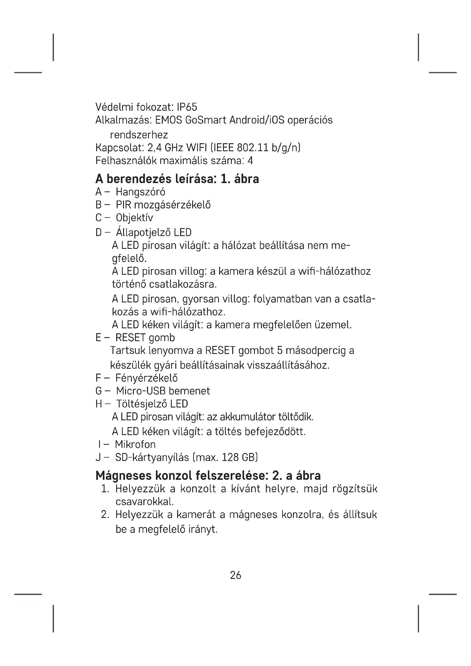 Az eszköz keresése sikerrel befejeződött. Erősítsük meg a kész gombbal. Kapcsolatok: Wi 2,4 GHz IEEE 802.11 b/g/n Frekvencia-tartomány: 2 400–2 4835 GHz EMOS spol. s r.o. igazolja, hogy a H4053 típusú rádióberende- zés megfelel a 2014/53/EU irányelvnek. Az EU-megfelelőségi nyilatkozat teljes szövege elérhető a következő internetes címen: http://www.emos.eu/download. Az elektromos készülékeket ne dobja a vegyes háztar- tási hulladék közé, használja a szelektív hulladékgyűj- tő helyeket. A gyűjtőhelyekre vonatkozó aktuális infor- mációkért forduljon a helyi hivatalokhoz. Ha az elek- tromos készülékek a hulladéktárolókba kerülnek, veszélyes anyagok szivároghatnak a talajvízbe, melyek így bejuthatnak a táplálékláncba és veszélyeztethetik az Ön egészségét és kényelmét.29 SI | IP kamera Vsebina kompleta: Kamera / Polnilni vmesnik / USB kabel / Magnetni nosilec / Vrtljiv nosilec / Set vijakov / Priročnik Tehnična specikacija: Napajanje: DC 5 V/1 A Dimenzije: 58 × 58 × 94 mm Neto teža: 225 g Ločljivost: 1 920 × 1 080 Senzor: 1/2,9‘‘ 2 Megapixel CMOS Zmogljivost akumulatorja: 9 600 mAh Območje zaznavanja PIR: 9 m PIR kot: 120° Objektiv: 3,2 mm, F2,0 Pomnilnik: SD kartica (max. 128 GB), Cloud storage Razred zaščite: IP65 APP: EMOS GoSmart for Android and iOS Povezava: 2,4 GHz WIFI (IEEE802.11b/g/n) Največje število uporabnikov: 4 Opis naprave: slika 1 A – Zvočnik B – PIR senzor C – Objektiv D – Statusna LED dioda Dioda sveti rdeče: nastavitev omrežja ni v redu. Dioda utripa rdeče: kamera se pripravlja na priključitev WiFi omrežja. Dioda utripa hitro rdeče: ravnokar poteka povezovanje na Wi omrežje. Dioda sveti modro: kamera deluje pravilno.30 E – Tipka RESET S pritiskom na tipko RESET za 5 s napravo ponastavite v tovarniške nastavitve. F – Svetlobni senzor G – Mikro USB vhod H – Indikator polnjenja Dioda sveti rdeče: baterija se polni. Dioda sveti modro: polnjenje končano. I – Mikrofon J – Reža za SD kartico (max. 128 GB) Namestitev magnetnega nosilca: slika 2a