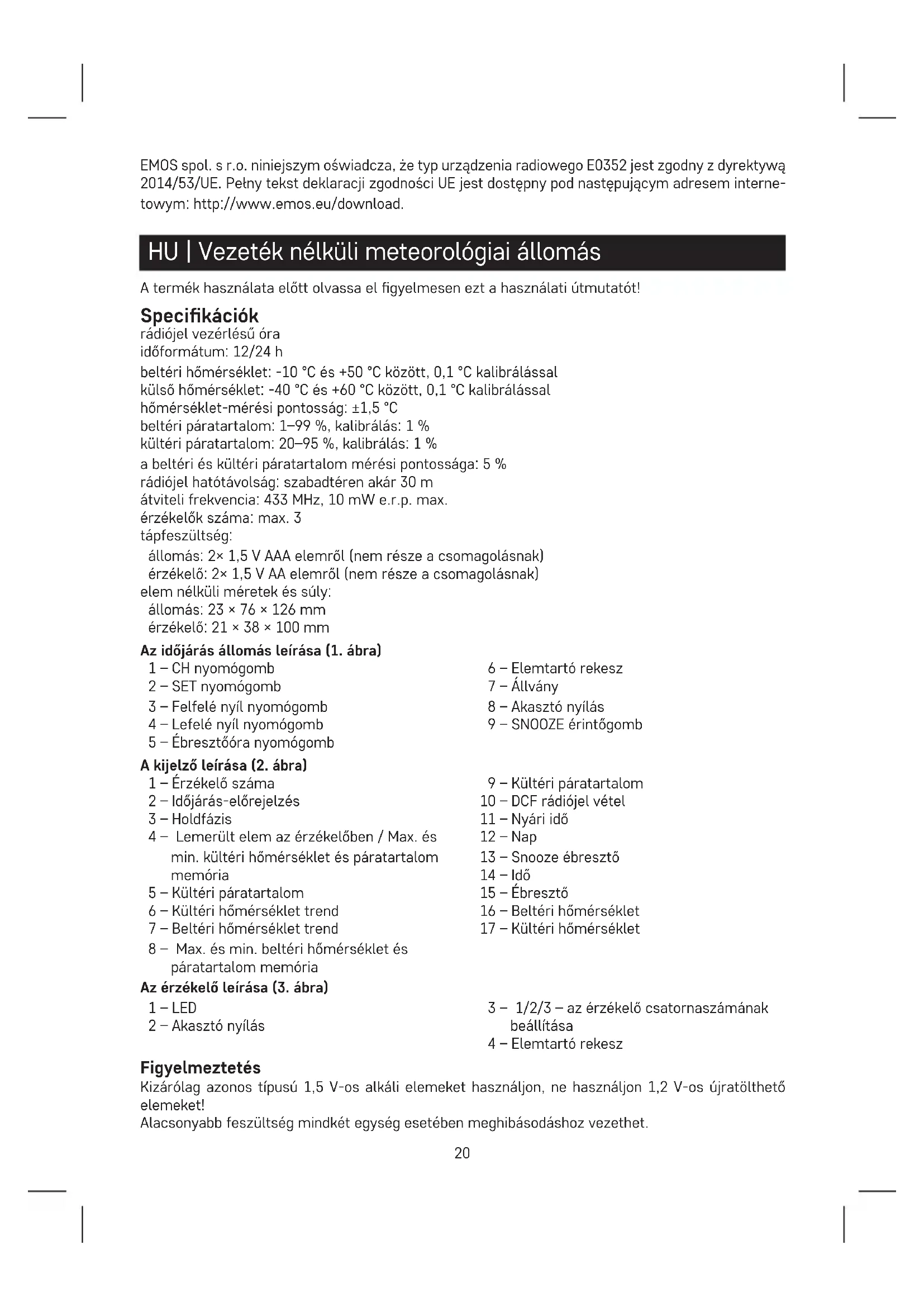 - Tego urządzenia nie mogą obsługiwać osoby (łącznie z dziećmi), których predyspozycje zyczne, umysłowe albo mentalne oraz brak wiedzy i doświadczenia nie pozwalają na bezpieczne korzy- stanie z urządzenia, jeżeli nie są one pod nadzorem lub nie zostały poinstruowane w zakresie korzystania z tego urządzenia przez osobę odpowiedzialną za ich bezpieczeństwo. Zgodnie z przepisami Ustawy o ZSEiE zabronione jest umieszczanie łącznie z innymi odpada- mi zużytego sprzętu oznakowanego symbolem przekreślonego kosza. Użytkownik, chcąc pozbyć się sprzętu elektronicznego i elektrycznego, jest zobowiązany do oddania go do punk- tu zbierania zużytego sprzętu. W sprzęcie nie znajdują się składniki niebezpieczne, które mają szczególnie negatywny wpływ na środowisko i zdrowie ludzi.20 EMOS spol. s r.o. niniejszym oświadcza, że typ urządzenia radiowego E0352 jest zgodny z dyrektywą 2014/53/UE. Pełny tekst deklaracji zgodności UE jest dostępny pod następującym adresem interne- towym: http://www.emos.eu/download. HU | Vezeték nélküli meteorológiai állomás A termék használata előtt olvassa el gyelmesen ezt a használati útmutatót! Specikációk rádiójel vezérlésű óra időformátum: 12/24 h beltéri hőmérséklet: -10 °C és +50 °C között, 0,1 °C kalibrálással külső hőmérséklet: -40 °C és +60 °C között, 0,1 °C kalibrálással hőmérséklet-mérési pontosság: ±1,5 °C beltéri páratartalom: 1–99 %, kalibrálás: 1 % kültéri páratartalom: 20–95 %, kalibrálás: 1 % a beltéri és kültéri páratartalom mérési pontossága: 5 % rádiójel hatótávolság: szabadtéren akár 30 m átviteli frekvencia: 433 MHz, 10 mW e.r.p. max. érzékelők száma: max. 3 tápfeszültség: állomás: 2× 1,5 V AAA elemről (nem része a csomagolásnak) érzékelő: 2× 1,5 V AA elemről (nem része a csomagolásnak) elem nélküli méretek és súly: állomás: 23 × 76 × 126 mm érzékelő: 21 × 38 × 100 mm Az időjárás állomás leírása (1. ábra) 1 – CH nyomógomb 2 – SET nyomógomb 3 – Felfelé nyíl nyomógomb 4 – Lefelé nyíl nyomógomb 5 – Ébresztőóra nyomógomb 6 – Elemtartó rekesz 7 – Állvány 8 – Akasztó nyílás 9 – SNOOZE érintőgomb A kijelző leírása (2. ábra) 1 – Érzékelő száma 2 – Időjárás-előrejelzés 3 – Holdfázis 4 – Lemerült elem az érzékelőben / Max. és min. kültéri hőmérséklet és páratartalom memória 5 – Kültéri páratartalom 6 – Kültéri hőmérséklet trend 7 – Beltéri hőmérséklet trend 8 – Max. és min. beltéri hőmérséklet és páratartalom memória 9 – Kültéri páratartalom 10 – DCF rádiójel vétel 11 – Nyári idő 12 – Nap 13 – Snooze ébresztő 14 – Idő 15 – Ébresztő 16 – Beltéri hőmérséklet 17 – Kültéri hőmérséklet Az érzékelő leírása (3. ábra) 1 – LED 2 – Akasztó nyílás 3 – 1/2/3 – az érzékelő csatornaszámának beállítása 4 – Elemtartó rekesz Figyelmeztetés Kizárólag azonos típusú 1,5 V-os alkáli elemeket használjon, ne használjon 1,2 V-os újratölthető elemeket! Alacsonyabb feszültség mindkét egység esetében meghibásodáshoz vezethet.21 Üzembehelyezés