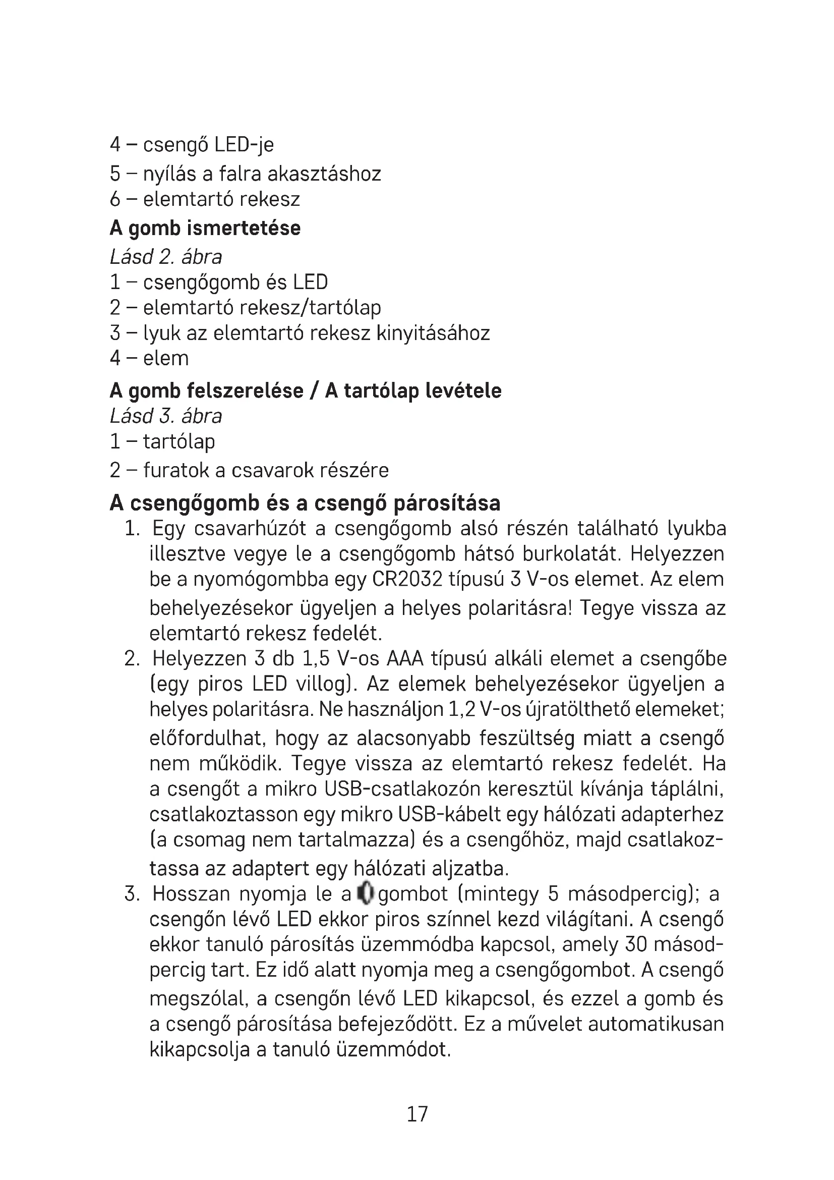 (egy piros LED villog). Az elemek behelyezésekor ügyeljen a helyes polaritásra. Ne használjon 1,2 V-os újratölthető elemeket; előfordulhat, hogy az alacsonyabb feszültség miatt a csengő nem működik. Tegye vissza az elemtartó rekesz fedelét. Ha a csengőt a mikro USB-csatlakozón keresztül kívánja táplálni, csatlakoztasson egy mikro USB-kábelt egy hálózati adapterhez (a csomag nem tartalmazza) és a csengőhöz, majd csatlakoz- tassa az adaptert egy hálózati aljzatba.
