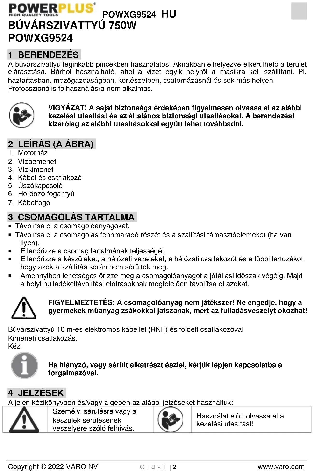 Használat előtt olvassa el a kezelési utasítást!POWXG9524 HU Copyright © 2022 VARO NV O l d a l | 3 www.varo.com