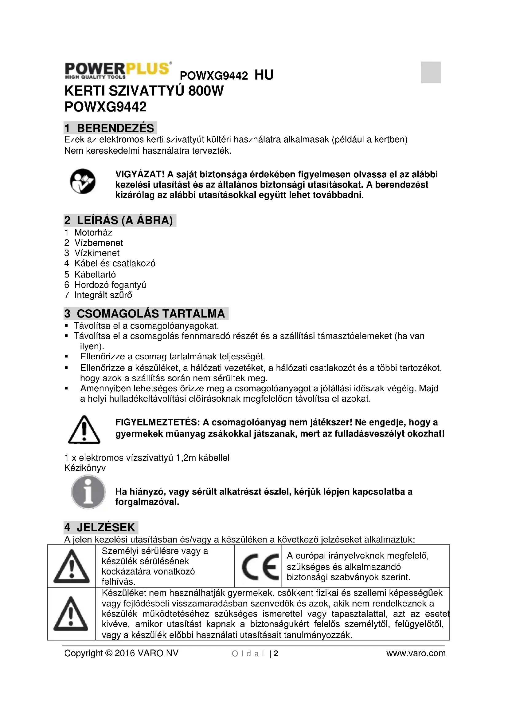 - VARO N.V. - Joseph Van Instraat 9 - BE2500 Lier - BELGIUM, kijelenti, hogy A termék típusa: Kerti Szivattyú Márkanév: POWERplus Cikkszám: POWXG9442 megfelel a harmonizált európai szabványok alkalmazásán alapuló, idevonatkozó európai irányelvek alapvető követelményeinek és egyéb vonatkozó rendelkezéseinek. A készülék bármilyen illetéktelen módosítása érvényteleníti a jelen nyilatkozatot. Európai irányelvek (ideértve, adott esetben, azok módosításait az aláírás időpontjáig); 2011/65/EU 2006/95/EK 2004/108/EK 2000/14/EC Annex V LwA 81dB(A) / 84dB(A) Harmonizált európai szabványok (ideértve, adott esetben, azok módosításait az aláírás időpontjáig); EN60335-1 : 2012 EN60335-2-41 : 2003 EN55014-1 : 2006 EN55014-2 : 1997 EN61000-3-2 : 2006 EN61000-3-3 : 2013 A műszaki dokumentáció birtokosa: Philippe Vankerkhove, VARO - Vic. Van Rompuy N.V. Az alulírott a társaság vezérigazgatója nevében jár el Hugo Cuypers Szabályozási Ügyek - Megfelelőségi Menedzser 26/06/2015POWXG9442 RU Copyright © 2016 VARO NV С т р . | 1 www.varo.com 1 ОБЛАСТЬ ПРИМЕНЕНИЯ p. 2