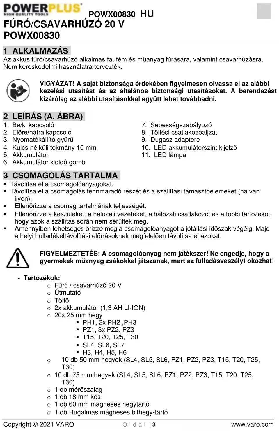 Mindig ellenőrizze, hogy a tápellátás megfelel-e az adattáblán feltüntetett feszültségnek.POWX00830 HU Copyright © 2021 VARO O l d a l | 5 www.varo.com