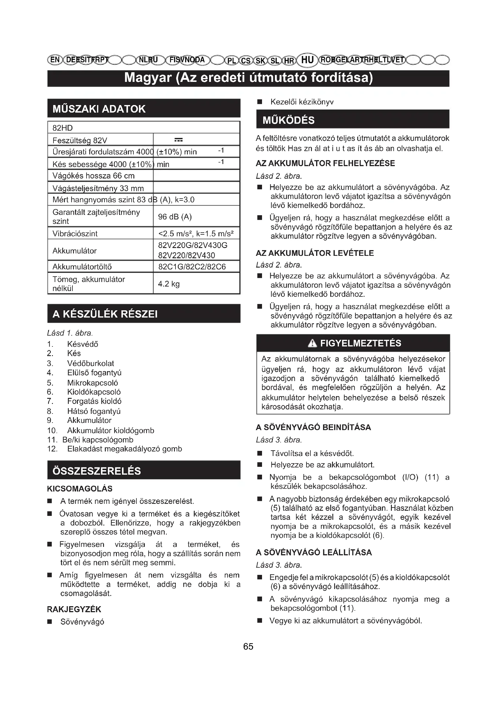 Lásd 2. ábra. Helyezze be az akkumulátort a sövényvágóba. Az akkumulátoron levő vájatot igazítsa a sövényvágón lévő kiemelkedő bordához. Ügyeljen rá, hogy a használat megkezdése előtt a sövényvágó rögzítőfüle bepattanjon a helyére és az akkumulátor rögzítve legyen a sövényvágóban. FIGYELMEZTETÉS Az akkumulátornak a sövényvágóba helyezésekor ügyeljen rá, hogy az akkumulátoron lévő vájat igazodjon a sövényvágón található kiemelkedő bordával, és megfelelően rögzüljön a helyén. Az akkumulátor helytelen behelyezése a belső részek károsodását okozhatja. A SÖVÉNYVÁGÓ BEINDÍTÁSA Lásd 3. ábra. Távolítsa el a késvédőt. Helyezze be az akkumulátort. Nyomja be a bekapcsológombot (I/O) (11) a készülék bekapcsolásához. A nagyobb biztonság érdekében egy mikrokapcsoló (5) található az első fogantyúban. Használat közben tartsa két kézzel a sövényvágót, egyik kezével nyomja be a mikrokapcsolót, és a másik kezével nyomja be a kioldókapcsolót (6). A SÖVÉNYVÁGÓ LEÁLLÍTÁSA Lásd 3. ábra. Engedje fel a mikrokapcsolót (5) és a kioldókapcsolót (6) a sövényvágó leállításához. A sövényvágó kikapcsolásához nyomja meg a bekapcsológombot (11). Vegye ki az akkumulátort a sövényvágóból. 65Magyar (Az eredeti útmutató fordítása)