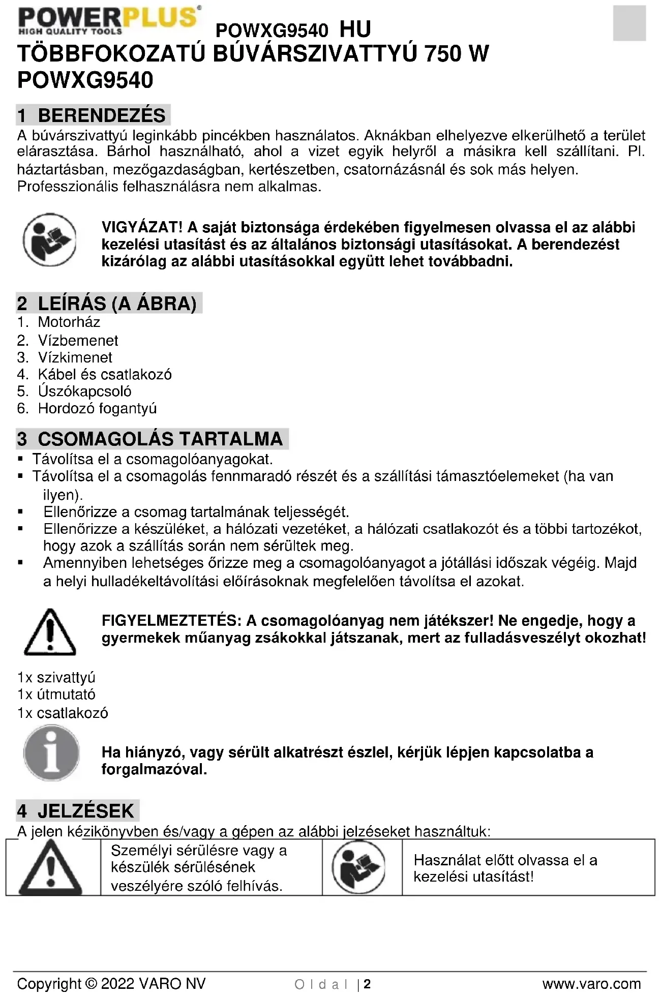 Használat előtt olvassa el a kezelési utasítást!POWXG9540 HU Copyright © 2022 VARO NV O l d a l | 3 www.varo.com