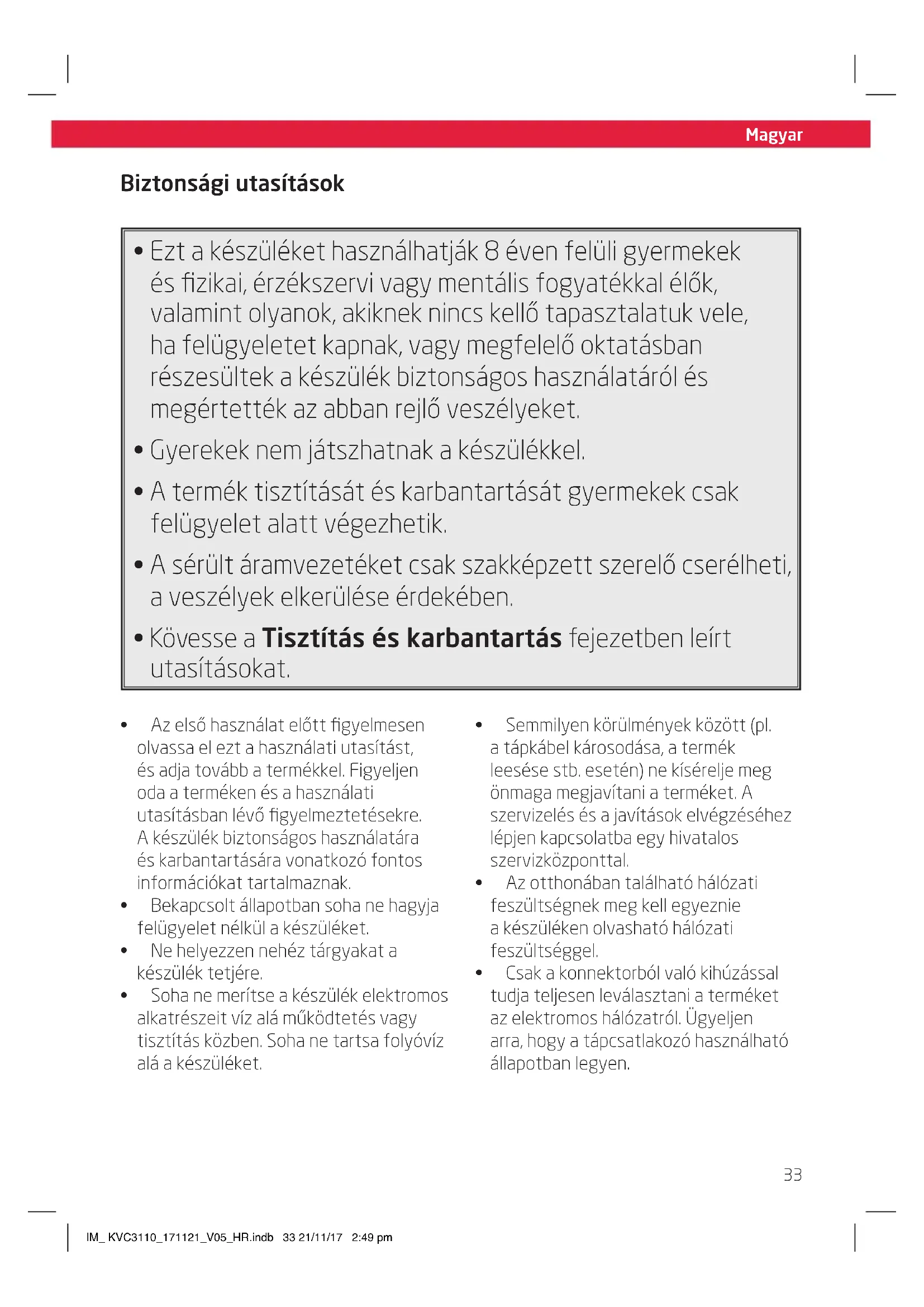 - Csak a konnektorból való kihúzással tudja teljesen leválasztani a terméket az elektromos hálózatról. Ügyeljen arra, hogy a tápcsatlakozó használható állapotban legyen. IM_ KVC3110_171121_V05_HR.indb 33 21/11/17 2:49 pmMagyar