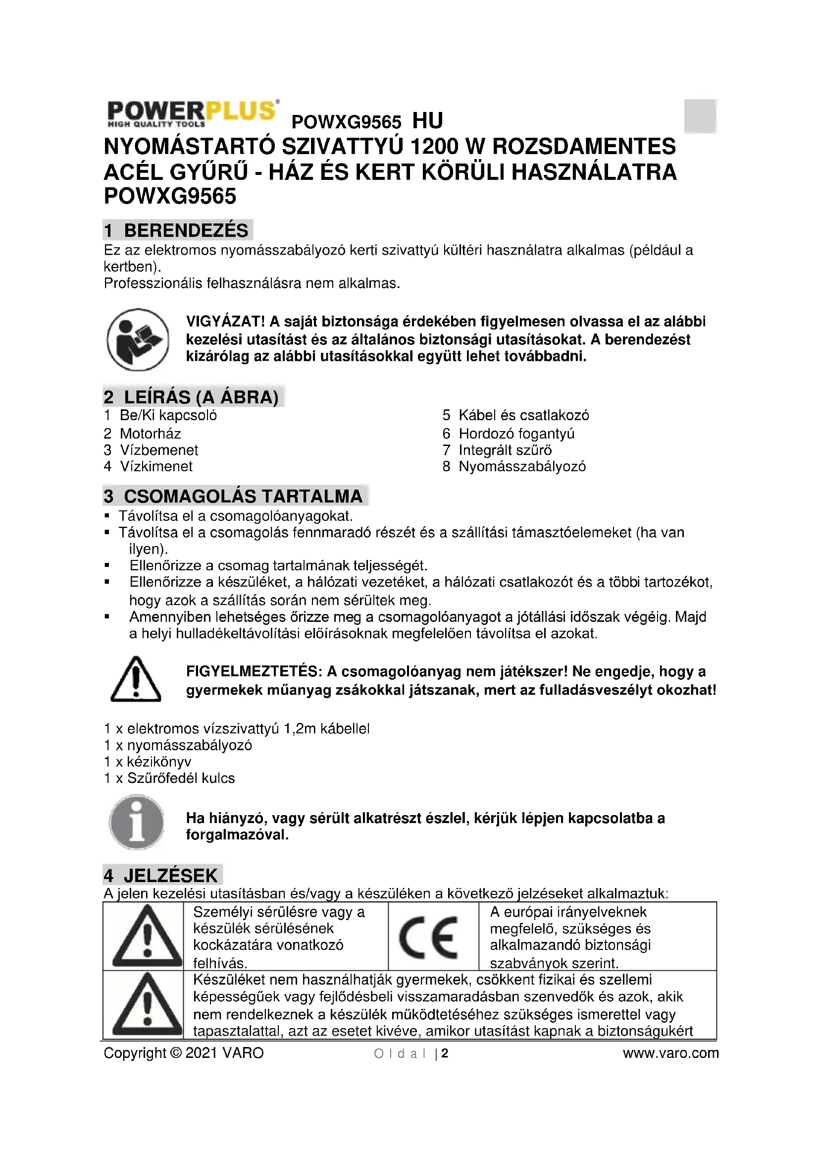 - A szivattyú nem alkalmas olyan úszómedencékben és tavakban történő használatra, ahol a személyek fizikai kapcsolatba kerülhetnek a vízzel, ezért erre a célra ne használja.POWXG9565 HU Copyright © 2021 VARO O l d a l | 5 www.varo.com