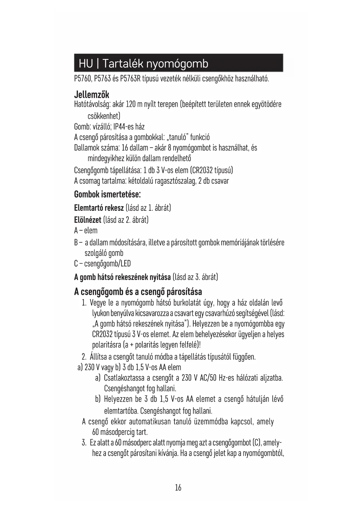 Megjegyzés: Az egyes gombok párosítása előtt a csengőt tanuló módba kell állítania – lásd a 2. lépést. Csengőnként legfeljebb 8 gombot párosíthat ezzel a módszerrel. Megjegyzés: A csengő belső memóriával rendelkezik, amelyben tárolja a jelenleg párosított gombok kódját áramkimaradás esetére. Amikor a csengő áramellátása helyreáll, 60 másodpercre automatikusan tanuló módba vált. Ha azonban a csengő a 60 másodperc alatt nem kap jelet (nem történik új párosítás), a tanuló mód vége után automatikusan betölti a korábban párosított gombok kódját. Áramkimaradás után ezért a gombokat nem kell ismét párosítani. Gombok párosításának törlése