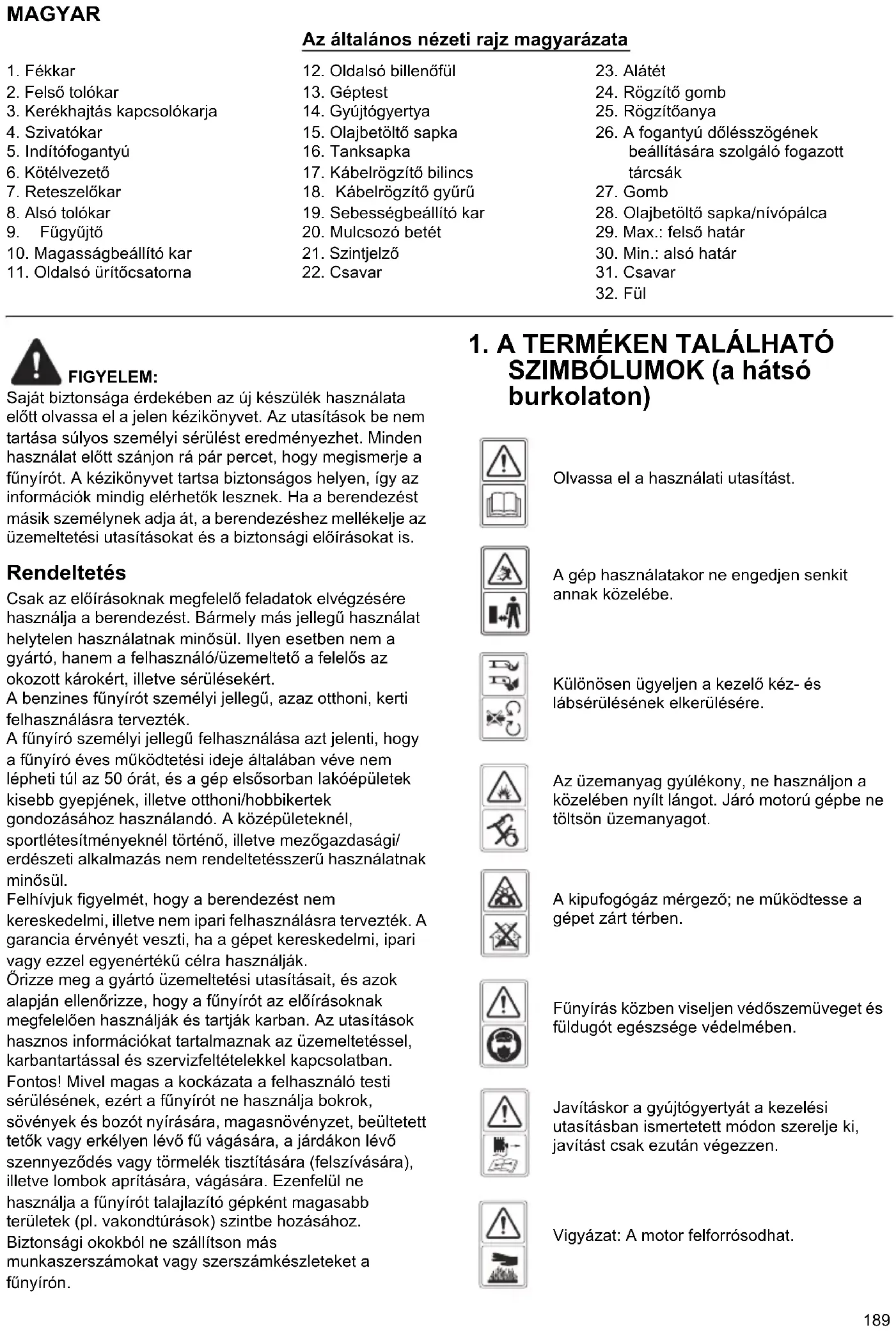 Olvassa el a használati utasítást. A gép használatakor ne engedjen senkit annak közelébe. Különösen ügyeljen a kezelő kéz- és lábsérülésének elkerülésére. Az üzemanyag gyúlékony, ne használjon a közelében nyílt lángot. Járó motorú gépbe ne töltsön üzemanyagot. A kipufogógáz mérgező; ne működtesse a gépet zárt térben. Fűnyírás közben viseljen védőszemüveget és füldugót egészsége védelmében. Javításkor a gyújtógyertyát a kezelési utasításban ismertetett módon szerelje ki, javítást csak ezután végezzen. Vigyázat: A motor felforrósodhat.190