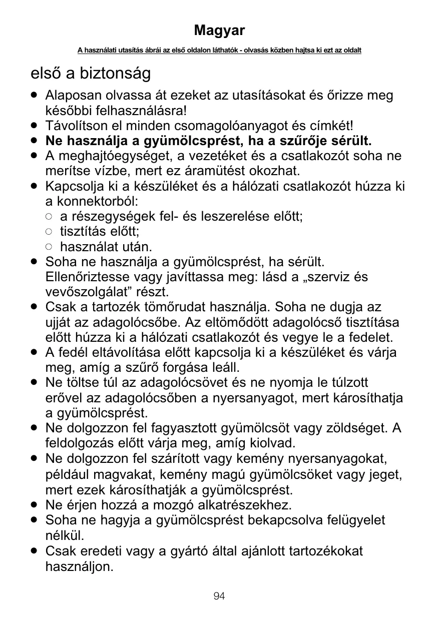 Alaposan olvassa át ezeket az utasításokat és őrizze meg későbbi felhasználásra! Távolítson el minden csomagolóanyagot és címkét! Ne használja a gyümölcsprést, ha a szűrője sérült. A meghajtóegységet, a vezetéket és a csatlakozót soha ne merítse vízbe, mert ez áramütést okozhat. Kapcsolja ki a készüléket és a hálózati csatlakozót húzza ki a konnektorból: a részegységek fel- és leszerelése előtt; tisztítás előtt; használat után. Soha ne használja a gyümölcsprést, ha sérült. Ellenőriztesse vagy javíttassa meg: lásd a „szerviz és vevőszolgálat” részt. Csak a tartozék tömőrudat használja. Soha ne dugja az ujját az adagolócsőbe. Az eltömődött adagolócső tisztítása előtt húzza ki a hálózati csatlakozót és vegye le a fedelet. A fedél eltávolítása előtt kapcsolja ki a készüléket és várja meg, amíg a szűrő forgása leáll. Ne töltse túl az adagolócsövet és ne nyomja le túlzott erővel az adagolócsőben a nyersanyagot, mert károsíthatja a gyümölcsprést. Ne dolgozzon fel fagyasztott gyümölcsöt vagy zöldséget. A feldolgozás előtt várja meg, amíg kiolvad. Ne dolgozzon fel szárított vagy kemény nyersanyagokat, például magvakat, kemény magú gyümölcsöket vagy jeget, mert ezek károsíthatják a gyümölcsprést. Ne érjen hozzá a mozgó alkatrészekhez. Soha ne hagyja a gyümölcsprést bekapcsolva felügyelet nélkül. Csak eredeti vagy a gyártó által ajánlott tartozékokat használjon. 94