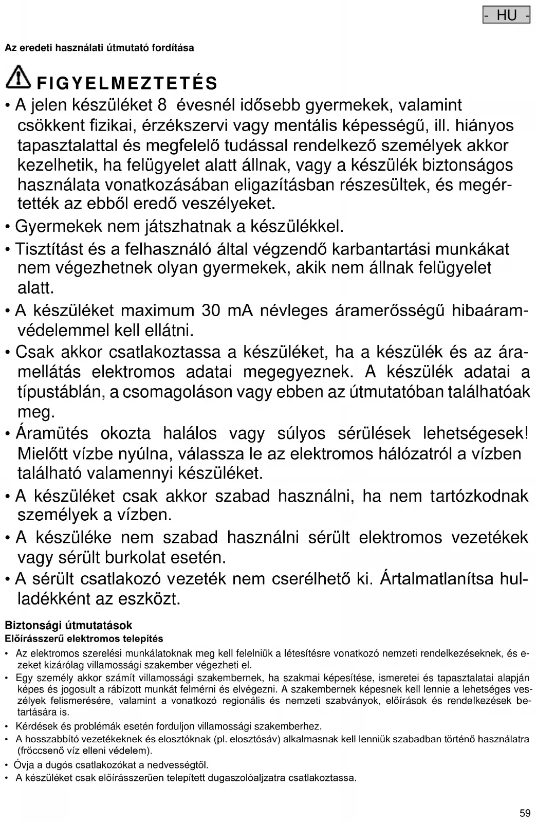 - Mielőtt vízbe nyúlna, feszültségmentesítse az összes, vízben lévő készüléket.