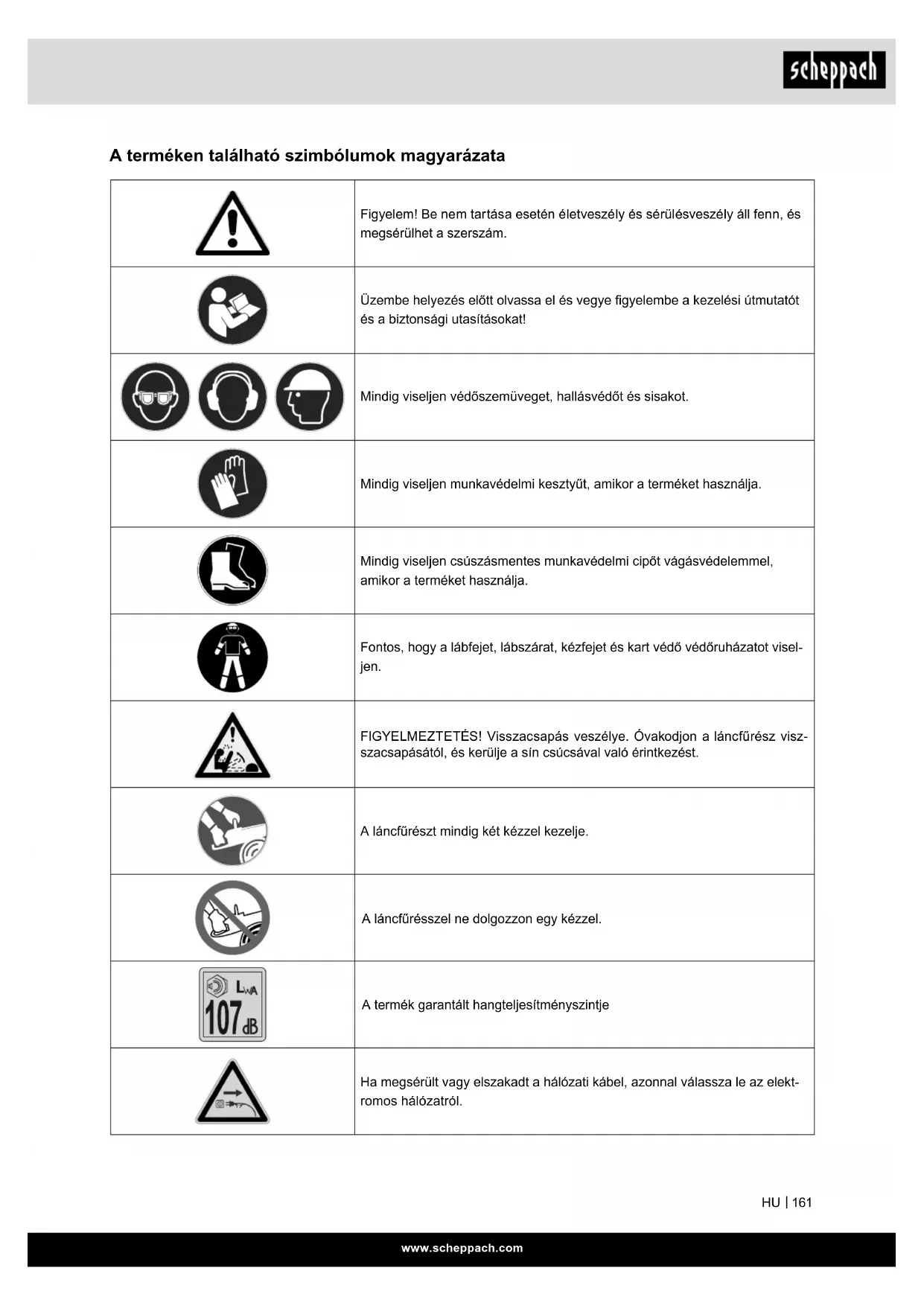 A terméken található szimbólumok magyarázata Figyelem! Be nem tartása esetén életveszély és sérülésveszély áll fenn, és megsérülhet a szerszám. Üzembe helyezés előtt olvassa el és vegye gyelembe a kezelési útmutatót és a biztonsági utasításokat! Mindig viseljen védőszemüveget, hallásvédőt és sisakot. Mindig viseljen munkavédelmi kesztyűt, amikor a terméket használja. Mindig viseljen csúszásmentes munkavédelmi cipőt vágásvédelemmel, amikor a terméket használja. Fontos, hogy a lábfejet, lábszárat, kézfejet és kart védő védőruházatot visel- jen. FIGYELMEZTETÉS! Visszacsapás veszélye. Óvakodjon a láncfűrész visz- szacsapásától, és kerülje a sín csúcsával való érintkezést. A láncfűrészt mindig két kézzel kezelje. A láncfűrésszel ne dolgozzon egy kézzel. A termék garantált hangteljesítményszintje Ha megsérült vagy elszakadt a hálózati kábel, azonnal válassza le az elekt- romos hálózatról.www.scheppach.com