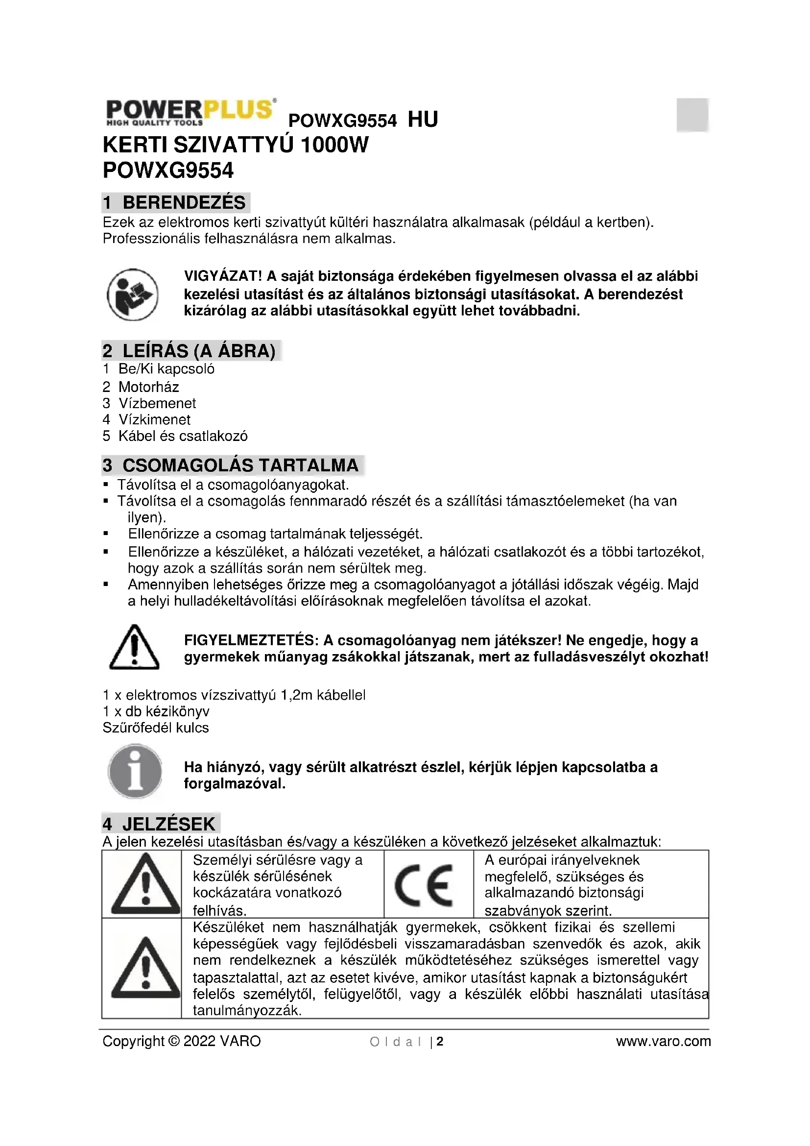 - A szivattyú kamráit időnként tisztítsa meg tiszta vízzel, hogy megelőzze a szennyeződés miatt keletkező eldugulást.POWXG9554 HU Copyright © 2022 VARO O l d a l | 5 www.varo.com