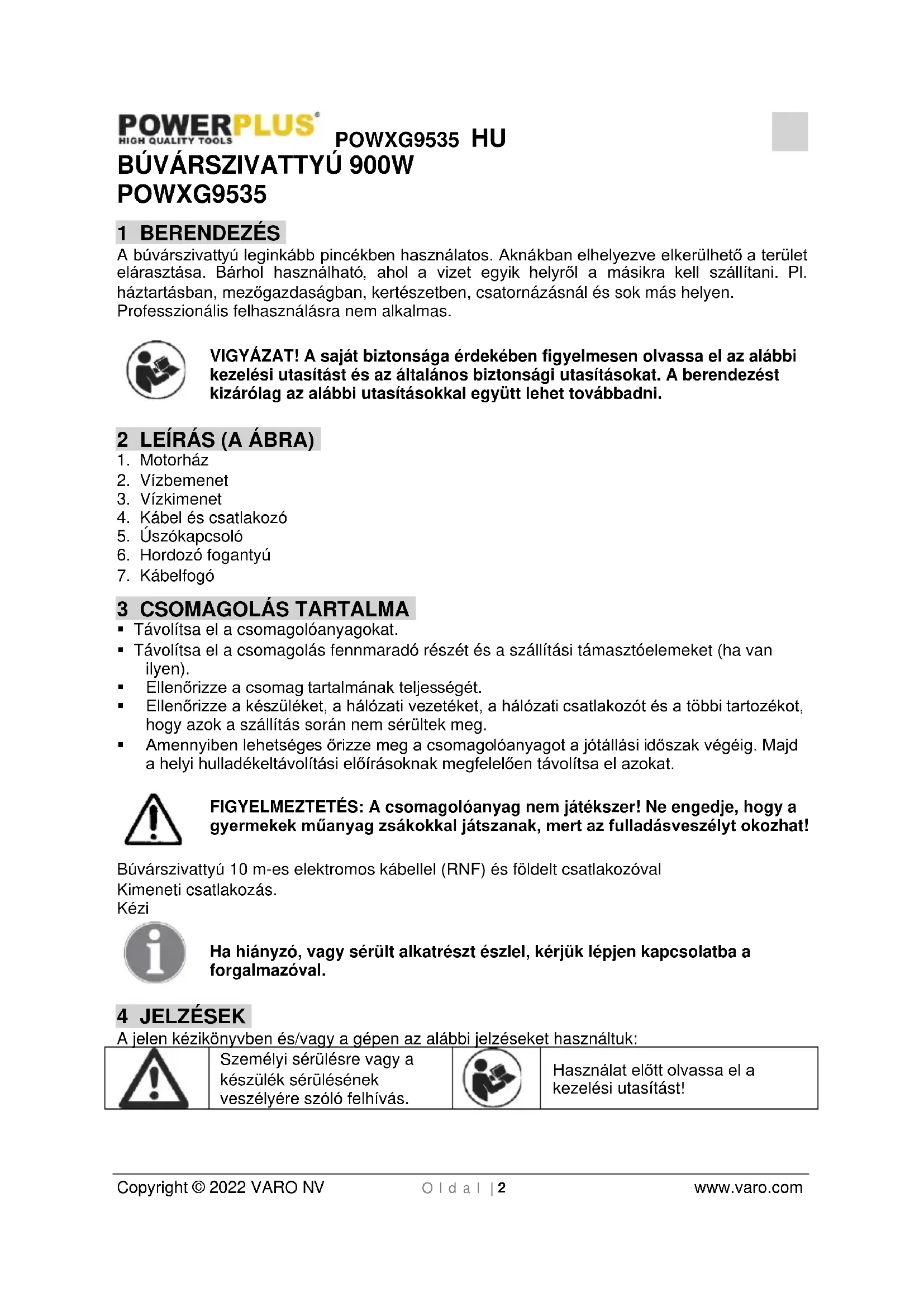 Használat előtt olvassa el a kezelési utasítást!POWXG9535 HU Copyright © 2022 VARO NV O l d a l | 3 www.varo.com