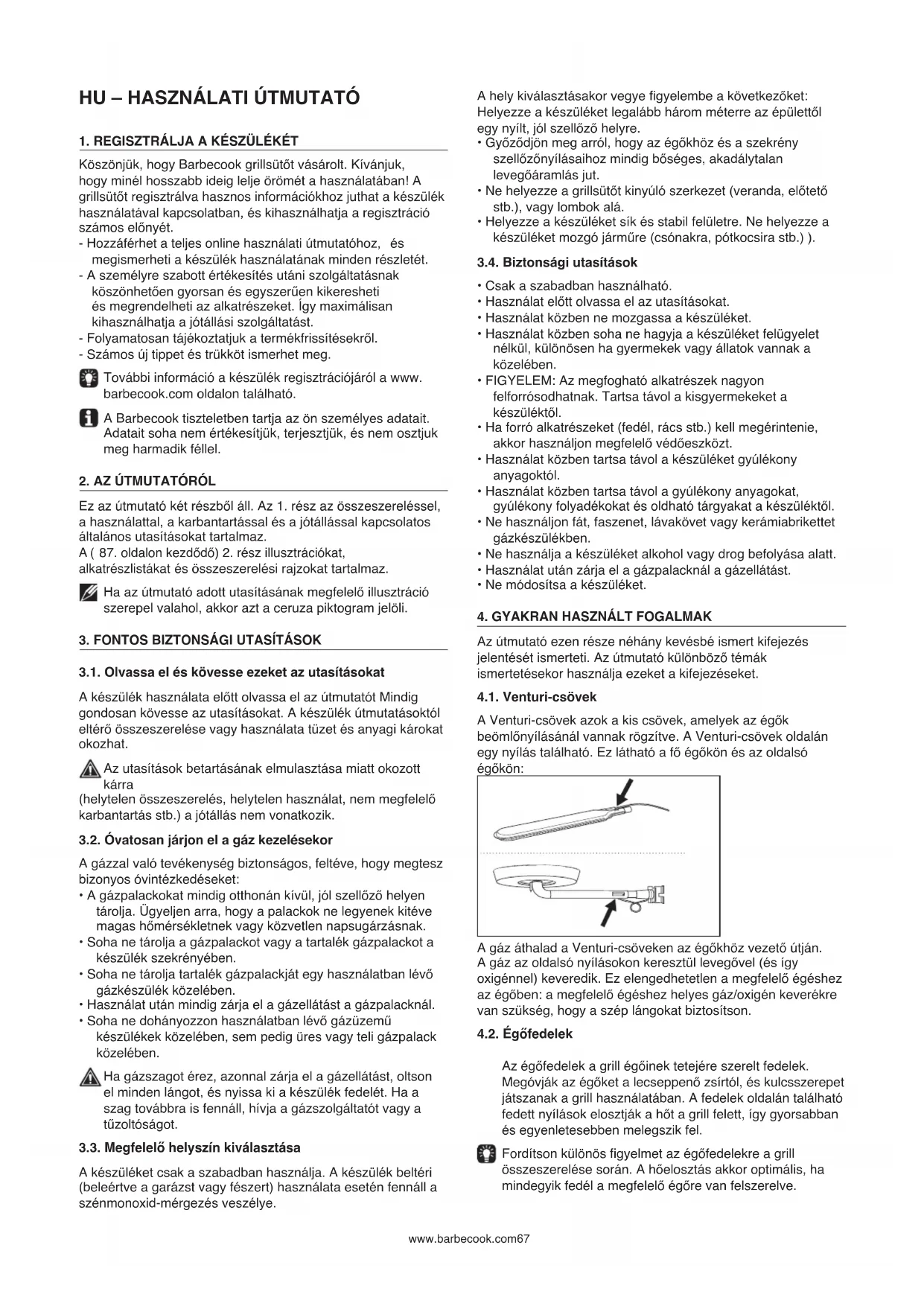 Az útmutató ezen része néhány kevésbé ismert kifejezés jelentését ismerteti. Az útmutató különböző témák ismertetésekor használja ezeket a kifejezéseket. 4.1. Venturi-csövek A Venturi-csövek azok a kis csövek, amelyek az égők beömlőnyílásánál vannak rögzítve. A Venturi-csövek oldalán egy nyílás található. Ez látható a fő égőkön és az oldalsó égőkön: A gáz áthalad a Venturi-csöveken az égőkhöz vezető útján. A gáz az oldalsó nyílásokon keresztül levegővel (és így oxigénnel) keveredik. Ez elengedhetetlen a megfelelő égéshez az égőben: a megfelelő égéshez helyes gáz/oxigén keverékre van szükség, hogy a szép lángokat biztosítson. 4.2. Égőfedelek Az égőfedelek a grill égőinek tetejére szerelt fedelek. Megóvják az égőket a lecseppenő zsírtól, és kulcsszerepet játszanak a grill használatában. A fedelek oldalán található fedett nyílások elosztják a hőt a grill felett, így gyorsabban és egyenletesebben melegszik fel. Fordítson különös gyelmet az égőfedelekre a grill összeszerelése során. A hőelosztás akkor optimális, ha mindegyik fedél a megfelelő égőre van felszerelve. www.barbecook.com 674.3. Zománc A készülék egyes részeit olvasztott üvegréteg, más néven zománc borítja. Ez a zománc megvédi az alatta lévő fémet a korróziótól. A zománc kiváló minőségű anyag: korrózióálló, nem bomlik le magas hőmérséklet hatására, és nagyon könnyen karbantartható. Mivel a zománc kevésbé rugalmas, mint a fém, amelyre felviszik, a készülék nem megfelelő használata esetén zománcdarabok pattoghatnak le. A probléma elkerülése érdekében legyen körültekintő a zománcozott alkatrészek összeszerelésekor, és mindig az útmutató utasításainak megfelelően tartsa karban a zománcot. 4.4. Felcsapó lángok A felcsapó lángok a tűztérből grillezés közben felcsapó hirtelen lángok. Ezt általában a lecseppenő zsír vagy pác okozza.