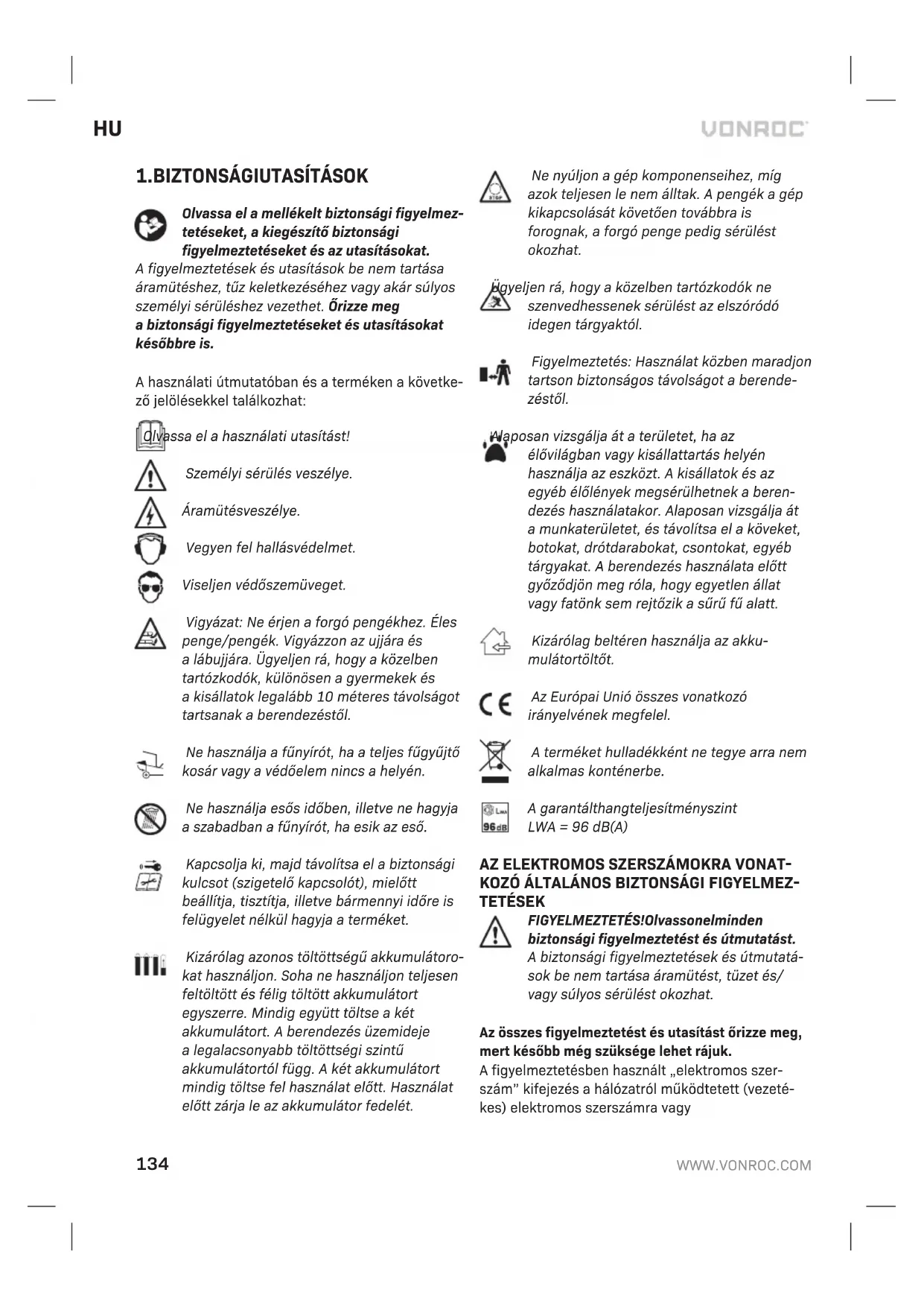 Olvassa el amellékelt biztonsági figyelmez- tetéseket, akiegészítő biztonsági figyelmeztetéseket és az utasításokat. Afigyelmeztetések és utasítások be nem tartása áramütéshez, tűz keletkezéséhez vagy akár súlyos személyi sérüléshez vezethet. Őrizze meg abiztonsági figyelmeztetéseket és utasításokat későbbre is. Ahasználati útmutatóban és aterméken akövetke- ző jelölésekkel találkozhat: Olvassa el ahasználati utasítást! Személyi sérülés veszélye. Áramütés veszélye. Vegyen fel hallásvédelmet. Viseljen védőszemüveget. Vigyázat: Ne érjen aforgó pengékhez. Éles penge/pengék. Vigyázzon az ujjára és alábujjára. Ügyeljen rá, hogy aközelben tartózkodók, különösen agyermekek és akisállatok legalább 10 méteres távolságot tartsanak aberendezéstől. Ne használja afűnyírót, ha ateljes fűgyűjtő kosár vagy avédőelem nincs ahelyén. Ne használja esős időben, illetve ne hagyja aszabadban afűnyírót, ha esik az eső. Kapcsolja ki, majd távolítsa el abiztonsági kulcsot (szigetelő kapcsolót), mielőtt beállítja, tisztítja, illetve bármennyi időre is felügyelet nélkül hagyja aterméket. Kizárólag azonos töltöttségű akkumulátoro- kat használjon. Soha ne használjon teljesen feltöltött és félig töltött akkumulátort egyszerre. Mindig együtt töltse akét akkumulátort. Aberendezés üzemideje alegalacsonyabb töltöttségi szintű akkumulátortól függ. Akét akkumulátort mindig töltse fel használat előtt. Használat előtt zárja le az akkumulátor fedelét. Ne nyúljon agép komponenseihez, míg azok teljesen le nem álltak. Apengék agép kikapcsolását követően továbbra is forognak, aforgó penge pedig sérülést okozhat. Ügyeljen rá, hogy aközelben tartózkodók ne szenvedhessenek sérülést az elszóródó idegen tárgyaktól. Figyelmeztetés: Használat közben maradjon tartson biztonságos távolságot aberende- zéstől. Alaposan vizsgálja át aterületet, ha az élővilágban vagy kisállattartás helyén használja az eszközt. Akisállatok és az egyéb élőlények megsérülhetnek aberen- dezés használatakor. Alaposan vizsgálja át amunkaterületet, és távolítsa el aköveket, botokat, drótdarabokat, csontokat, egyéb tárgyakat. Aberendezés használata előtt győződjön meg róla, hogy egyetlen állat vagy fatönk sem rejtőzik asűrű fű alatt. Kizárólag beltéren használja az akku- mulátortöltőt. Az Európai Unió összes vonatkozó irányelvének megfelel. Aterméket hulladékként ne tegye arra nem alkalmas konténerbe. Agarantált hangteljesítményszint LWA = 96 dB(A)