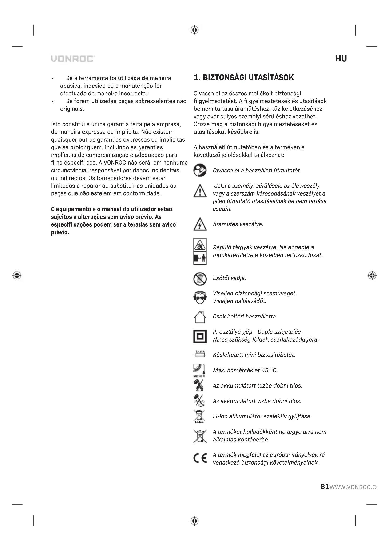 - Nem eredeti pótalkatrészeket használtak. A jelen garancia a vállalat által (akár kifejezetten, akár hallgatólagosan) biztosított kizárólagos garancia. Nem léteznek olyan egyéb garanciák (sem kifejezett, sem hallgatólagos garanciák, beleértve az értékesíthetőségre és az adott célra való alkalmasságra vonatkozó hallgatólagos garanciákat is), amelyek a jelen garancia hatókörén túlmutatnak. A VONROC semmilyen esetben sem felelős semmilyen járulékos vagy következményes kárért. A forgalmazók jogorvoslati teendői az előírásoknak nem megfelelő egységek vagy alkatrészek javítására és cseréjére korlátozódik. A termék és a használati útmutató változtatásának jogát fenntartjuk. A műszaki adatok előzetes bejelentés nélkül változhatnak.