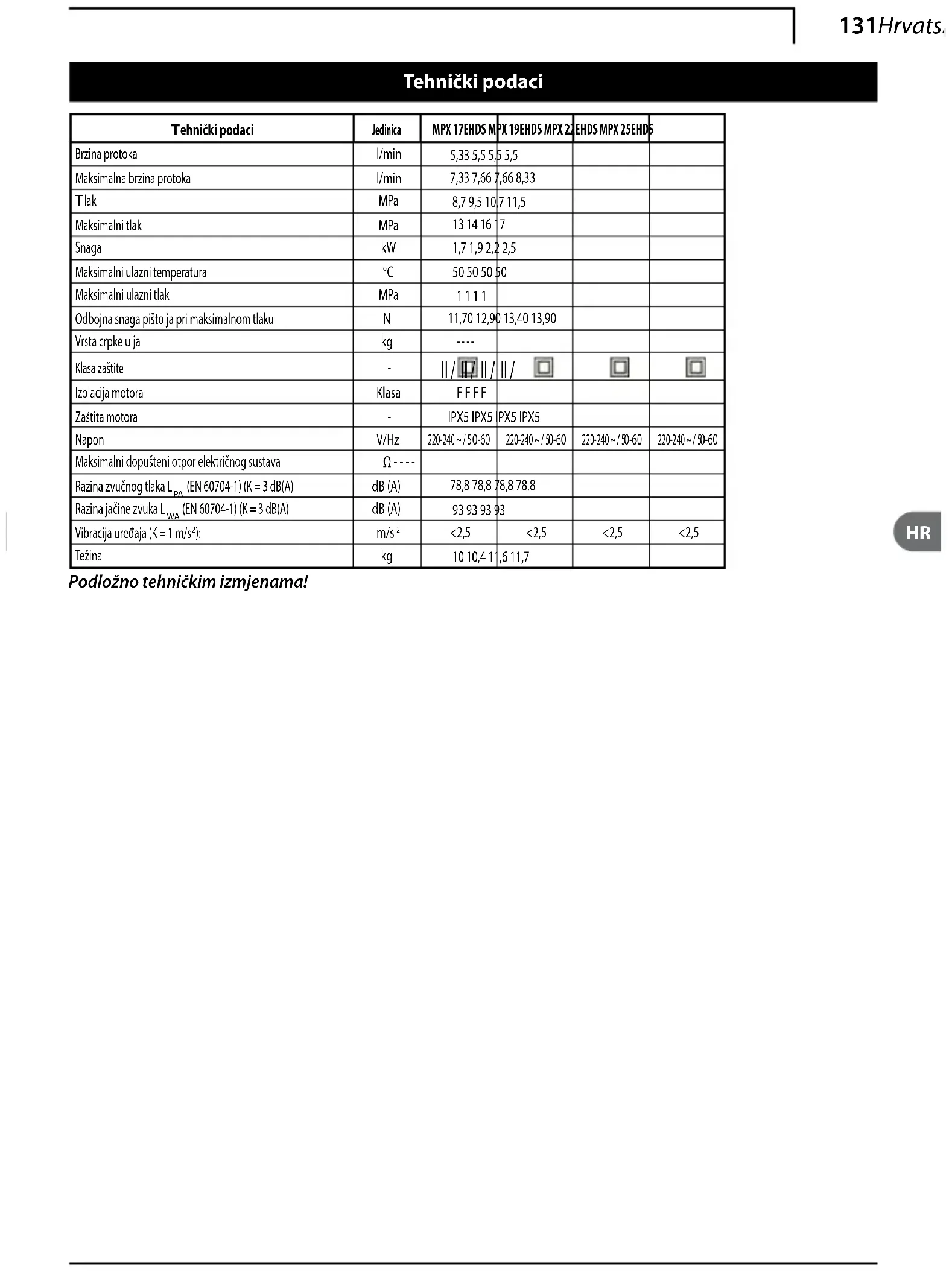 űszaki adatokEgységMPX 17EHDS MPX 19EHDS MPX 22EHDS MPX 25EHDSÁtfolyási sebességl/perc5,33 5,5 5,5 5,5Maximális átfolyási sebességl/perc7,33 7,66 7,66 8,33 yomás MPa 8,7 9,5 10,7 11,5Maximális nyomás MPa 13 14 16 17Teljesítmény