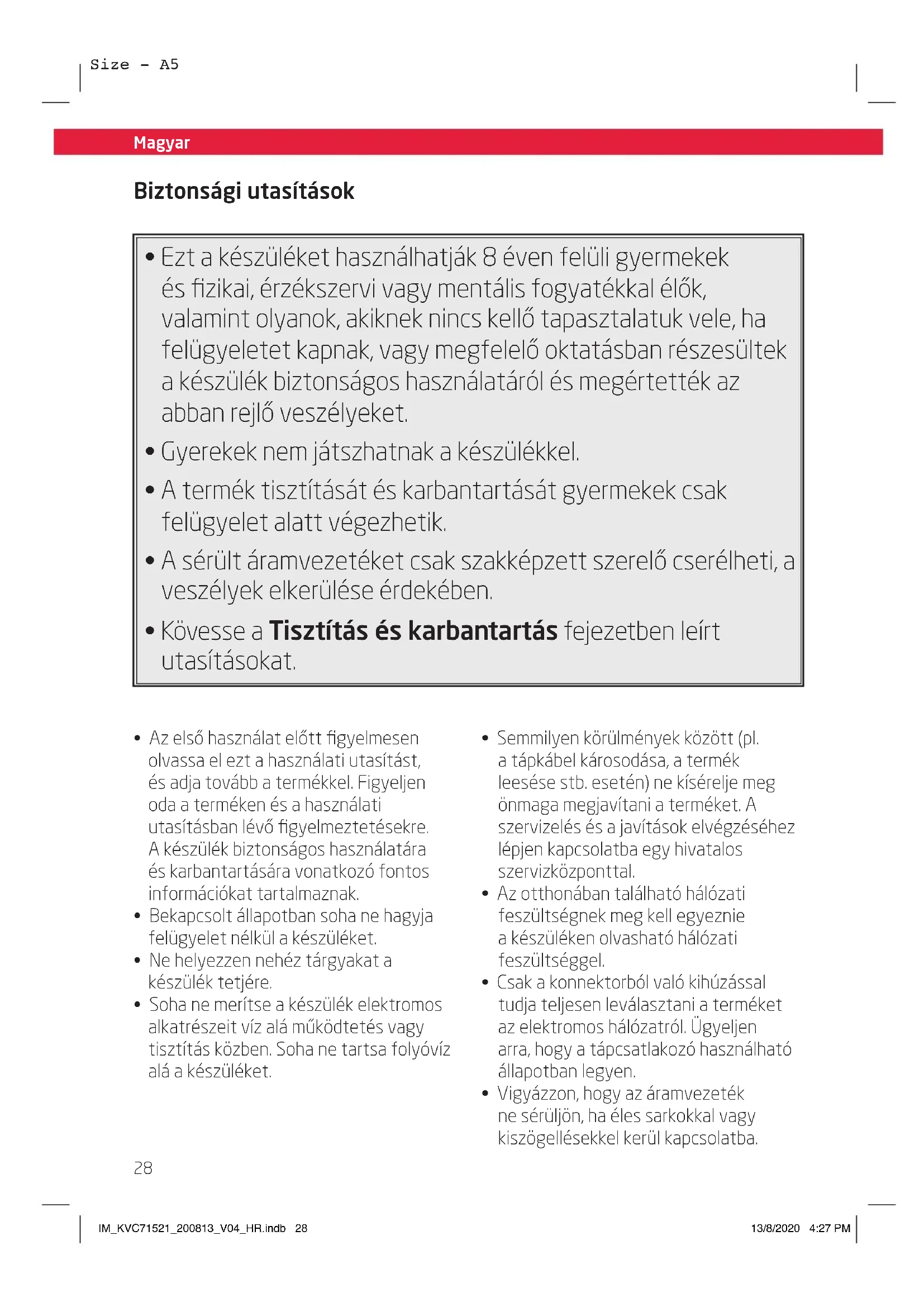 - Soha ne merítse vízbe a készülék elektromos alkatrészeit működés vagy tisztítás közben. Soha ne tartsa a készüléket folyóvíz alá. IM_KVC71521_200813_V04_HR.indb 31IM_KVC71521_200813_V04_HR.indb 31 13/8/2020 4:27 PM13/8/2020 4:27 PMSize - A5