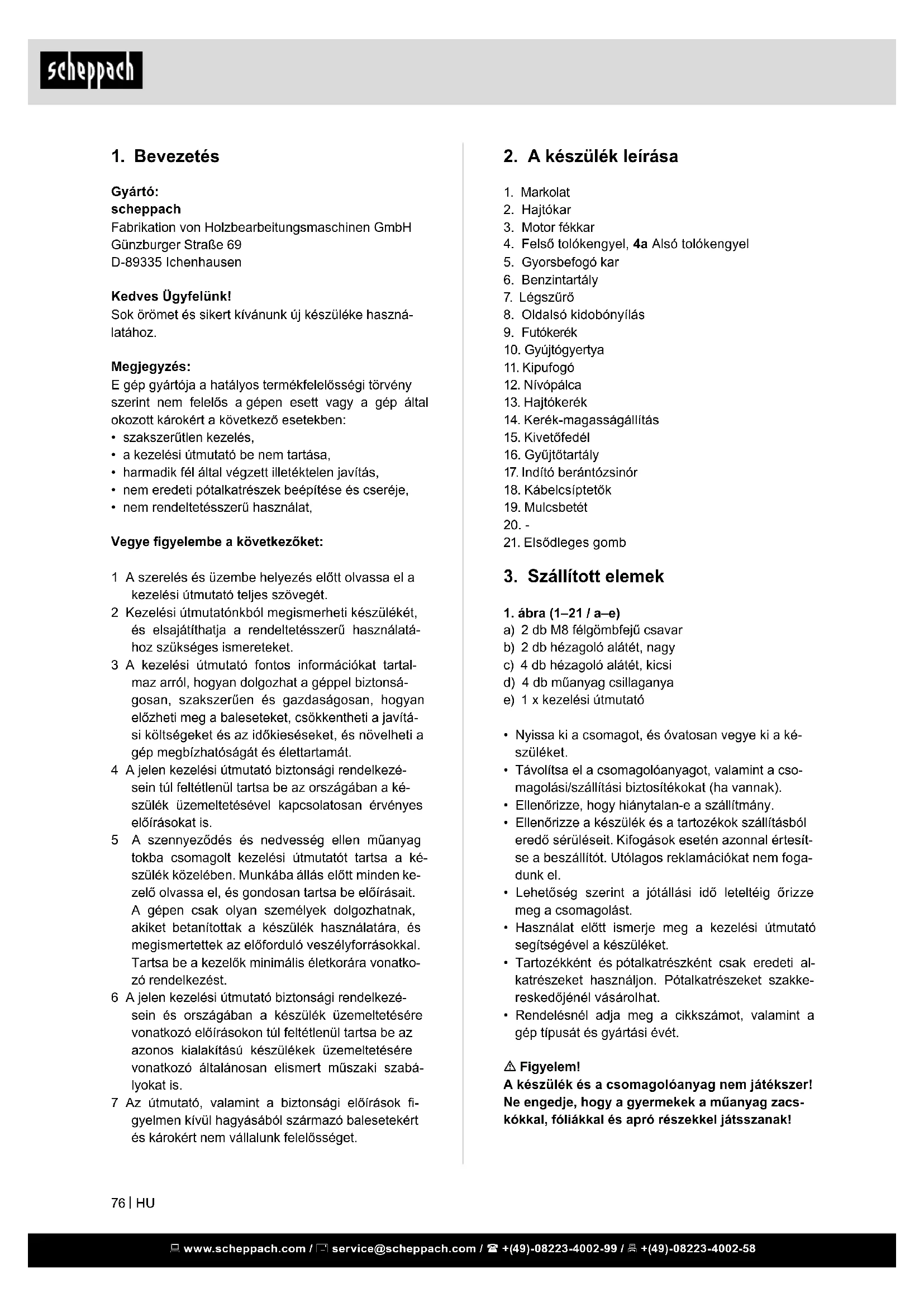 - A benzines fűnyíró magáncélú használatra alkal- mas a ház körüli és hobbikertekben. A fűnyíró ház körüli és hobbikertekben való magáncélú haszná- lata azt jelenti, hogy az éves használat alapvető- en nem lépi túl az 50 órát, és túlnyomórészt füves vagy gyepes területek gondozására, nem pedig nyilvános tereken, parkokban, sportlétesítmények- ben, valamint mezőgazdaságban vagy erdőgazda- ságban használják. Figyelem! A kezelő testi épségének veszélyeztetése miatt a fűnyírót nem szabad a következő munkákra használni: bozót, sövény és cserje vágására; lejtős területen, beültetett tetőkön vagy balkonládákban www.scheppach.com / service@scheppach.com / +(49)-08223-4002-99 / +(49)-08223-4002-58