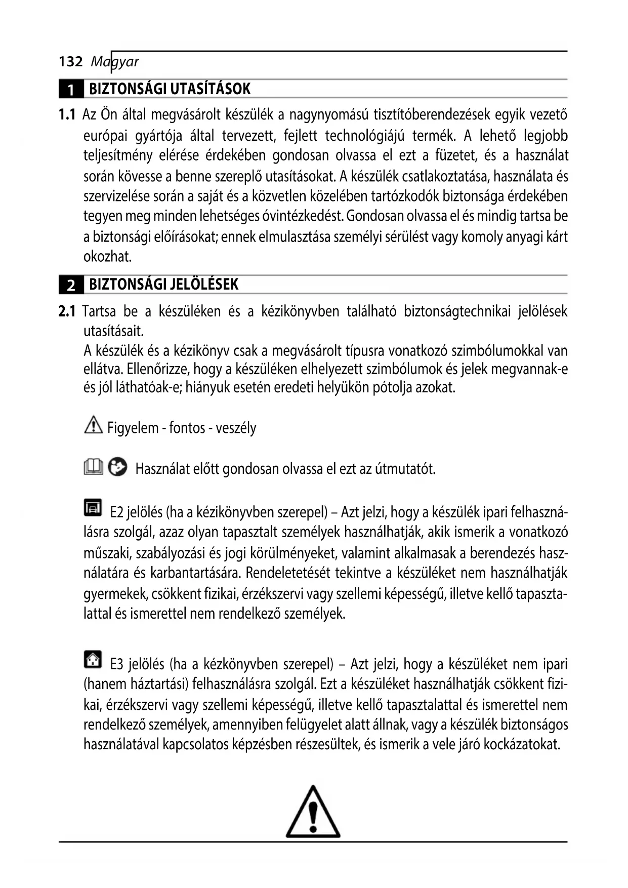 utasításait. A készülék és a kézikönyv csak a megvásárolt típusra vonatkozó szimbólumokkal van ellátva. Ellenőrizze, hogy a készüléken elhelyezett szimbólumok és jelek megvannak-e és jól láthatóak-e; hiányuk esetén eredeti helyükön pótolja azokat. Figyelem - fontos - veszély Használat előtt gondosan olvassa el ezt az útmutatót. E2 jelölés (ha a kézikönyvben szerepel) – Azt jelzi, hogy a készülék ipari felhaszná- lásra szolgál, azaz olyan tapasztalt személyek használhatják, akik ismerik a vonatkozó műszaki, szabályozási és jogi körülményeket, valamint alkalmasak a berendezés hasz- nálatára és karbantartására. Rendeletetését tekintve a készüléket nem használhatják gyermekek, csökkent fizikai, érzékszervi vagy szellemi képességű, illetve kellő tapaszta- lattal és ismerettel nem rendelkező személyek. E3 jelölés (ha a kézkönyvben szerepel) – Azt jelzi, hogy a készüléket nem ipari (hanem háztartási) felhasználásra szolgál. Ezt a készüléket használhatják csökkent fizi- kai, érzékszervi vagy szellemi képességű, illetve kellő tapasztalattal és ismerettel nem rendelkező személyek, amennyiben felügyelet alatt állnak, vagy a készülék biztonságos használatával kapcsolatos képzésben részesültek, és ismerik a vele járó kockázatokat.133Magyar Mozgó alkatrészek. Ne érjen hozzá. 0 Kapcsoló „KI” állása
