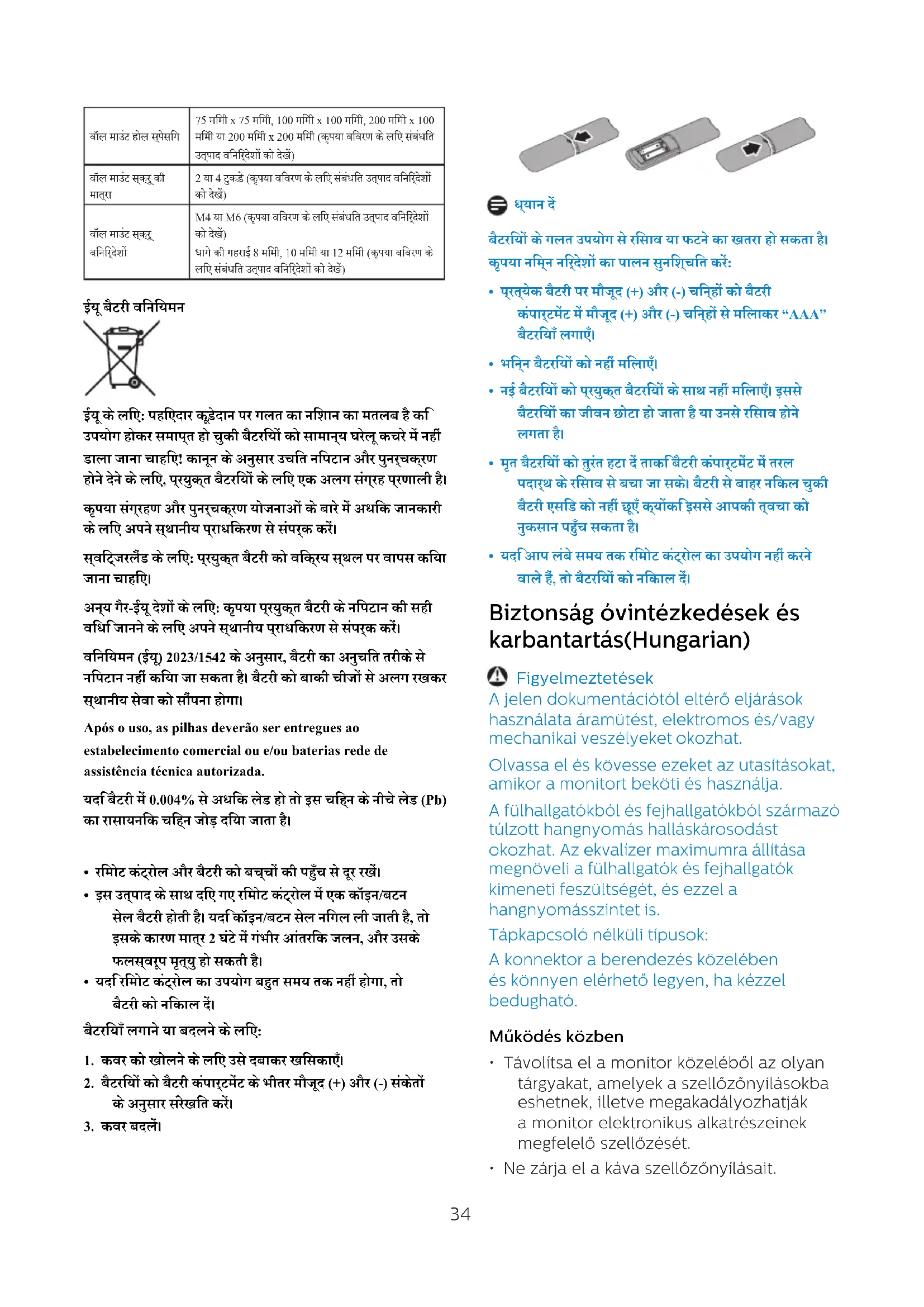- Ha úgy gondolja, hogy az elemet lenyelték vagy testbe jutott, azonnal forduljon orvoshoz. Falra szerelési útmutató (a falra szerelési funkcióval rendelkező modellekre vonatkozik) Ez a termékcsomag nem tartalmaz falra szereléshez való pótalkatrészeket. Ha falra szerelés szükséges, kérjük, mindenképpen lépjen kapcsolatba a gyártóval. Fali rögzítőfuratok távolsága 75 mm x 75 mm, 100 mm x 100 mm, 200 mm x 100 mm vagy 200 mm x 200 mm (a részletekért kérjük, tekintse meg a megfelelő termékleírásokat) Fali rögzítő csavarok mennyisége 2 vagy 4 darab (a részletekért kérjük, olvassa el a megfelelő termékleírást)36 A falra szereléshez szükséges csavarok jellemzői M4 vagy M6 (a részleteket lásd a megfelelő termékleírásokban) Menetmélység 8 mm, 10 mm vagy 12 mm (a részletekért kérjük, tekintse meg a megfelelő termékleírást) Az Európai Unió akkumulátorokra vonatkozó rendelete EU esetén: Az áthúzott szemetes azt jelzi, hogy a használt akkumulátorokat tilos háztartási hulladékba dobni! A használt akkumulátorok számára egy külön gyűjtőrendszer létezik, amely lehetővé teszi a jogszabályoknak megfelelő kezelést és újrahasznosítást. A gyűjtési és újrahasznosítási módokról érdeklődjön a helyi hatóságnál. Svájc esetén: A használt elemet a vásárlás helyére kell visszavinni. Más, EU-n kívüli országok esetén: A használt elemek helyes hulladékkezeléséről érdeklődjön a helyi hatóságnál. A 2023/1542 EU rendelet értelmében az elemek ártalmatlanítása nem történhet meg helytelenül. Az elemeket külön kell gyűjteni a helyi szolgáltató számára. Após o uso, as pilhas deverão ser entregues ao estabelecimento comercial ou e/ou baterias rede de assistência técnica autorizada. Ha az akkumulátor(ok) 0,004 %-nál több ólmot tartalmaz(nak), a szimbólum alatt az ólom (Pb) kémiai jelét kell feltüntetni.