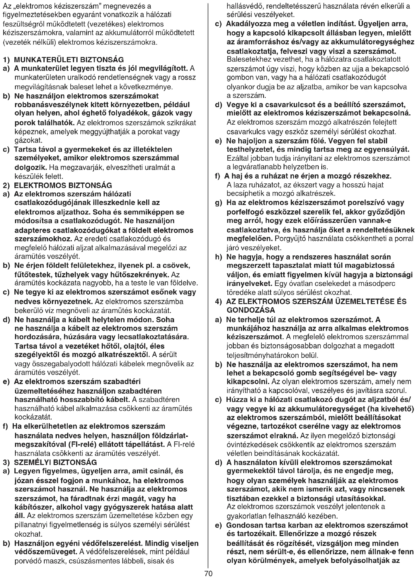 a) A munkaterület legyen tiszta és jól megvilágított. A munkaterületen uralkodó rendetlenségnek vagy a rossz megvilágításnak baleset lehet a következménye. b) Ne használjon elektromos szerszámokat robbanásveszélynek kitett környezetben, például olyanhelyen,aholéghetőfolyadékok,gázokvagy porok találhatók. Az elektromos szerszámok szikrákat képeznek, amelyek meggyújthatják a porokat vagy gázokat. c) Tartsa távol a gyermekeket és az illetéktelen személyeket, amikor elektromos szerszámmal dolgozik. Ha megzavarják, elveszítheti uralmát a készülék felett.