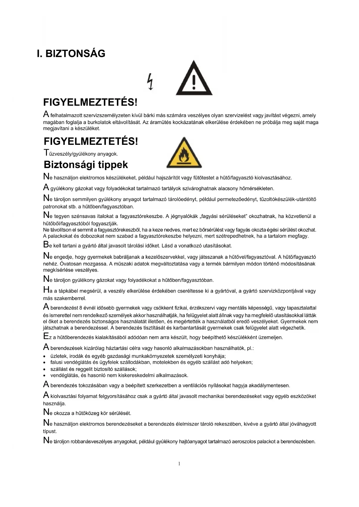 FIGYELMEZTETÉS! A felhatalmazott szervizszemélyzeten kívül bárki más számára veszélyes olyan szervizelést vagy javítást végezni, amely magában foglalja a burkolatok eltávolítását. Az áramütés kockázatának elkerülése érdekében ne próbálja meg saját maga megjavítani a készüléket. FIGYELMEZTETÉS! Tűzveszély/gyúlékony anyagok. Biztonsági tippek Ne használjon elektromos készülékeket, például hajszárítót vagy fűtőtestet a hűtő/fagyasztó kiolvasztásához. A gyúlékony gázokat vagy folyadékokat tartalmazó tartályok szivároghatnak alacsony hőmérsékleten. Ne tároljon semmilyen gyúlékony anyagot tartalmazó tárolóedényt, például permetezőedényt, tűzoltókészülék-utántöltő patronokat stb. a hűtőben/fagyasztóban. Ne tegyen szénsavas italokat a fagyasztórekeszbe. A jégnyalókák „fagyási sérüléseket” okozhatnak, ha közvetlenül a hűtőből/fagyasztóból fogyasztják. Ne távolítson el semmit a fagyasztórekeszből, ha a keze nedves, mert ez bőrsérülést vagy fagyás okozta égési sérülést okozhat. A palackokat és dobozokat nem szabad a fagyasztórekeszbe helyezni, mert szétrepedhetnek, ha a tartalom megfagy. Be kell tartani a gyártó által javasolt tárolási időket. Lásd a vonatkozó utasításokat. Ne engedje, hogy gyermekek babráljanak a kezelőszervekkel, vagy játsszanak a hűtővel/fagyasztóval. A hűtő/fagyasztó nehéz. Óvatosan mozgassa. A műszaki adatok megváltoztatása vagy a termék bármilyen módon történő módosításának megkísérlése veszélyes. Ne tároljon gyúlékony gázokat vagy folyadékokat a hűtőben/fagyasztóban. Ha a tápkábel megsérül, a veszély elkerülése érdekében cseréltesse ki a gyártóval, a gyártó szervizközpontjával vagy más szakemberrel. A berendezést 8 évnél idősebb gyermekek vagy csökkent fizikai, érzékszervi vagy mentális képességű, vagy tapasztalattal és ismerettel nem rendelkező személyek akkor használhatják, ha felügyelet alatt állnak vagy ha megfelelő utasításokkal látták el őket a berendezés biztonságos használatát illetően, és megértették a használatból eredő veszélyeket. Gyermekek nem játszhatnak a berendezéssel. A berendezés tisztítását és karbantartását gyermekek csak felügyelet alatt végezhetik. Ez a hűtőberendezés kialakításából adódóan nem arra készült, hogy beépíthető készülékként üzemeljen. A berendezések kizárólag háztartási célra vagy hasonló alkalmazásokban használhatók, pl.: