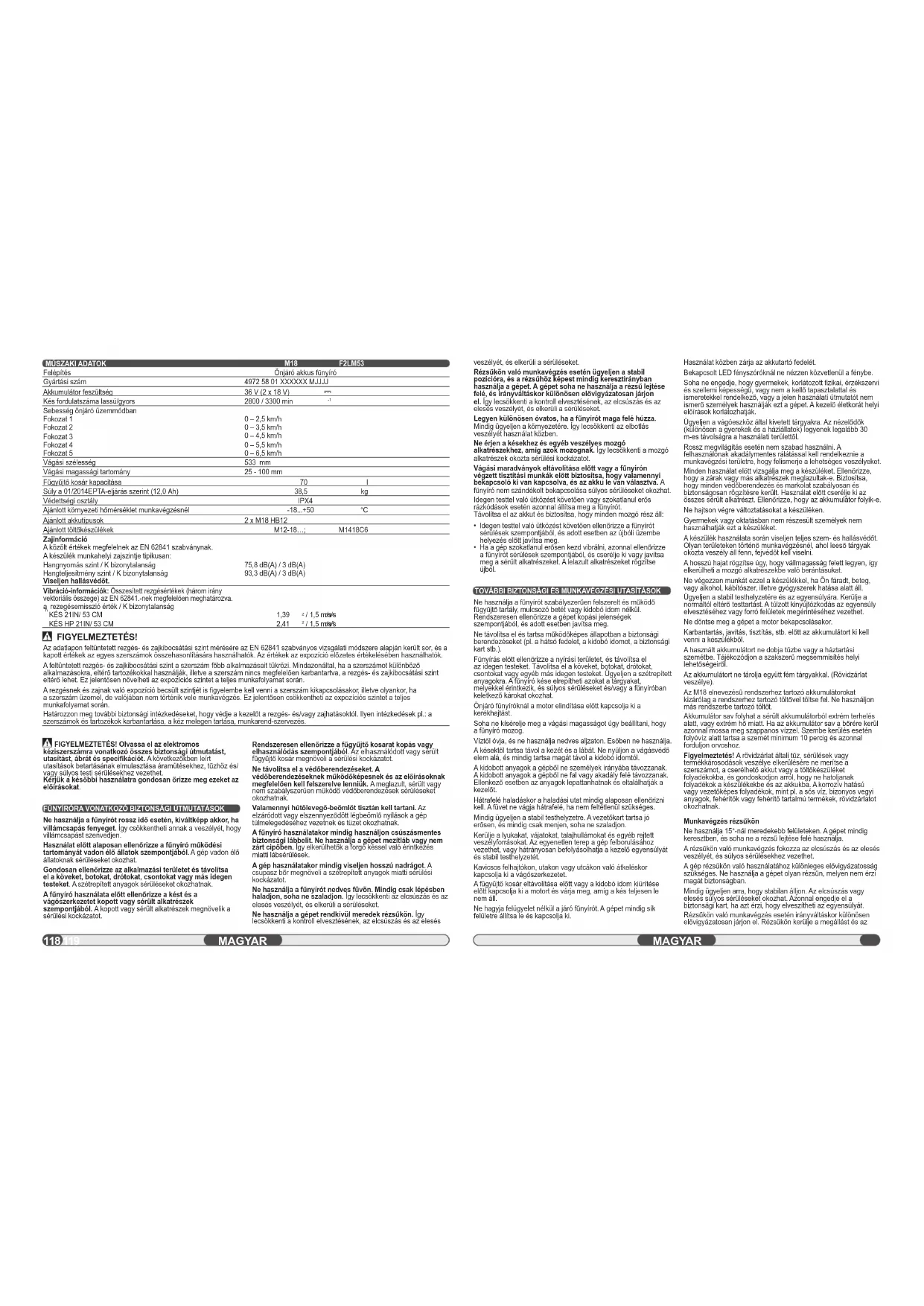 - Ha a gép szokatlanul erősen kezd vibrálni, azonnal ellenőrizze a fűnyírót sérülések szempontjából, és cserélje ki vagy javítsa meg a sérült alkatrészeket. A lelazult alkatrészeket rögzítse újból. TOVÁBBI BIZTONSÁGI ÉS MUNKAVÉGZÉSI UTASÍTÁSOK Ne használja a fűnyírót szabályszerűen felszerelt és működő fűgyűjtő tartály, mulcsozó betét vagy kidobó idom nélkül. Rendszeresen ellenőrizze a gépet kopási jelenségek szempontjából, és adott esetben javítsa meg. Ne távolítsa el és tartsa működőképes állapotban a biztonsági berendezéseket (pl. a hátsó fedelet, a kidobó idomot, a biztonsági kart stb.). Fűnyírás előtt ellenőrizze a nyírási területet, és távolítsa el az idegen testeket. Távolítsa el a köveket, botokat, drótokat, csontokat vagy egyéb más idegen testeket. Ügyeljen a szétrepített anyagokra. A fűnyíró kése elrepítheti azokat a tárgyakat, melyekkel érintkezik, és súlyos sérüléseket és/vagy a fűnyíróban keletkező károkat okozhat. Önjáró fűnyíróknál a motor elindítása előtt kapcsolja ki a kerékhajtást. Soha ne kísérelje meg a vágási magasságot úgy beállítani, hogy a fűnyíró mozog. Víztől óvja, és ne használja nedves aljzaton. Esőben ne használja. A késektől tartsa távol a kezét és a lábát. Ne nyúljon a vágásvédő elem alá, és mindig tartsa magát távol a kidobó idomtól. A kidobott anyagok a gépből ne személyek irányába távozzanak. A kidobott anyagok a gépből ne fal vagy akadály felé távozzanak. Ellenkező esetben az anyagok lepattanhatnak és eltalálhatják a kezelőt. Hátrafelé haladáskor a haladási utat mindig alaposan ellenőrizni kell. A füvet ne vágja hátrafelé, ha nem feltétlenül szükséges. Mindig ügyeljen a stabil testhelyzetre. A vezetőkart tartsa jó erősen, és mindig csak menjen, soha ne szaladjon. Kerülje a lyukakat, vájatokat, talajhullámokat és egyéb rejtett veszélyforrásokat. Az egyenetlen terep a gép felborulásához vezethet, vagy hátrányosan befolyásolhatja a kezelő egyensúlyát és stabil testhelyzetét. Kavicsos felhajtókon, utakon vagy utcákon való átkeléskor kapcsolja ki a vágószerkezetet. A fűgyűjtő kosár eltávolítása előtt vagy a kidobó idom kiürítése előtt kapcsolja ki a motort és várja meg, amíg a kés teljesen le nem áll. Ne hagyja felügyelet nélkül a járó fűnyírót. A gépet mindig sík felületre állítsa le és kapcsolja ki. Használat közben zárja az akkutartó fedelét. Bekapcsolt LED fényszóróknál ne nézzen közvetlenül a fénybe. Soha ne engedje, hogy gyermekek, korlátozott fi zikai, érzékszervi és szellemi képességű, vagy nem a kellő tapasztalattal és ismeretekkel rendelkező, vagy a jelen használati útmutatót nem ismerő személyek használják ezt a gépet. A kezelő életkorát helyi előírások korlátozhatják. Ügyeljen a vágóeszköz által kivetett tárgyakra. Az nézelődők (különösen a gyerekek és a háziállatok) legyenek legalább 30 m-es távolságra a használati területtől. Rossz megvilágítás esetén nem szabad használni. A felhasználónak akadálymentes rálátással kell rendelkeznie a munkavégzési területre, hogy felismerje a lehetséges veszélyeket. Minden használat előtt vizsgálja meg a készüléket. Ellenőrizze, hogy a zárak vagy más alkatrészek meglazultak-e. Biztosítsa, hogy minden védőberendezés és markolat szabályosan és biztonságosan rögzítésre került. Használat előtt cserélje ki az összes sérült alkatrészt. Ellenőrizze, hogy az akkumulátor folyik-e. Ne hajtson végre változtatásokat a készüléken. Gyermekek vagy oktatásban nem részesült személyek nem használhatják ezt a készüléket. A készülék használata során viseljen teljes szem- és hallásvédőt. Olyan területeken történő munkavégzésnél, ahol leeső tárgyak okozta veszély áll fenn, fejvédőt kell viselni. A hosszú hajat rögzítse úgy, hogy vállmagasság felett legyen, így elkerülheti a mozgó alkatrészekbe való berántásukat. Ne végezzen munkát ezzel a készülékkel, ha Ön fáradt, beteg, vagy alkohol, kábítószer, illetve gyógyszerek hatása alatt áll. Ügyeljen a stabil testhelyzetére és az egyensúlyára. Kerülje a normáltól eltérő testtartást. A túlzott kinyújtózkodás az egyensúly elvesztéséhez vagy forró felületek megérintéséhez vezethet. Ne döntse meg a gépet a motor bekapcsolásakor. Karbantartás, javítás, tisztítás, stb. előtt az akkumulátort ki kell venni a készülékből. A használt akkumulátort ne dobja tűzbe vagy a háztartási szemétbe. Tájékozódjon a szakszerű megsemmisítés helyi lehetőségeiről. Az akkumulátort ne tárolja együtt fém tárgyakkal. (Rövidzárlat veszélye). Az M18 elnevezésű rendszerhez tartozó akkumulátorokat kizárólag a rendszerhez tartozó töltővel töltse fel. Ne használjon más rendszerbe tartozó töltő