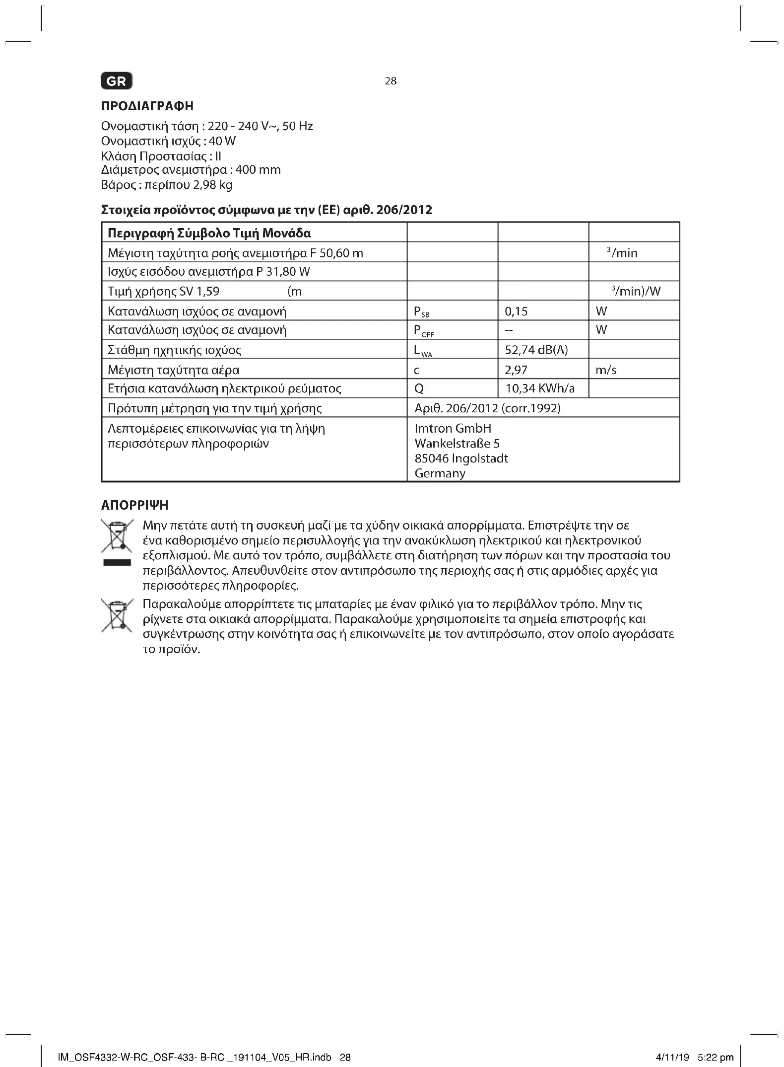 A tisztításhoz használjon puha törlőruhát. Ha a koszt nehéz eltávolítani, használjon enyhe tisztítószert. SPECIFIKÁCIÓ Névleges feszültség : 220 - 240 V~, 50 Hz Névleges teljesítmény : 40 W Védelmi osztály : II Ventilátor átmérő : 400 mm Tömeg : kb. 2,98 kg Termékinformáció a (EU) No. 206/2012 szerint Leírás Szimbólum Érték Egység Ventilátor maximális légáram F 50,60 m