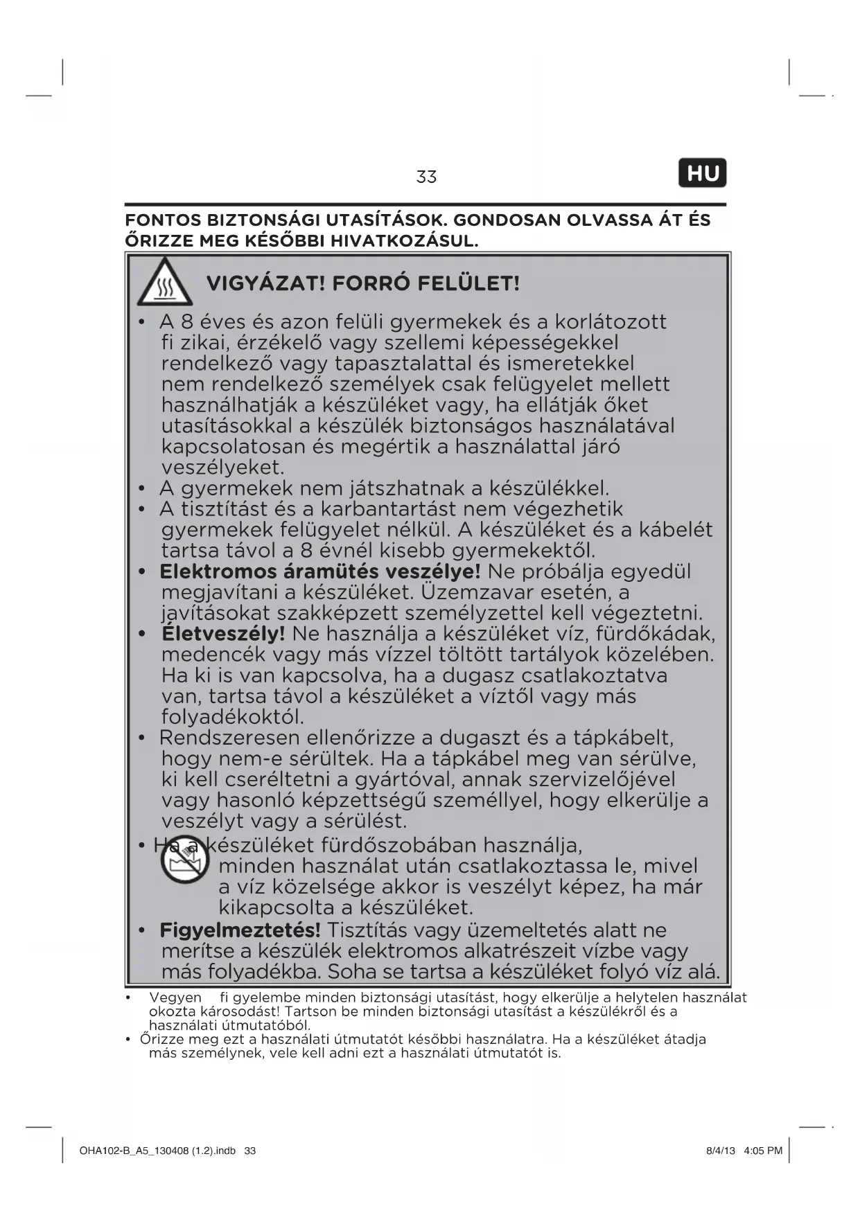 - Használat közben ne takarja le a levegő bemeneti vagy kimeneti nyílást. Tartsa kötszer- és hajmentesen. OHA102-B_A5_130408 (1.2).indb 34OHA102-B_A5_130408 (1.2).indb 34 8/4/13 4:05 PM8/4/13 4:05 PM35