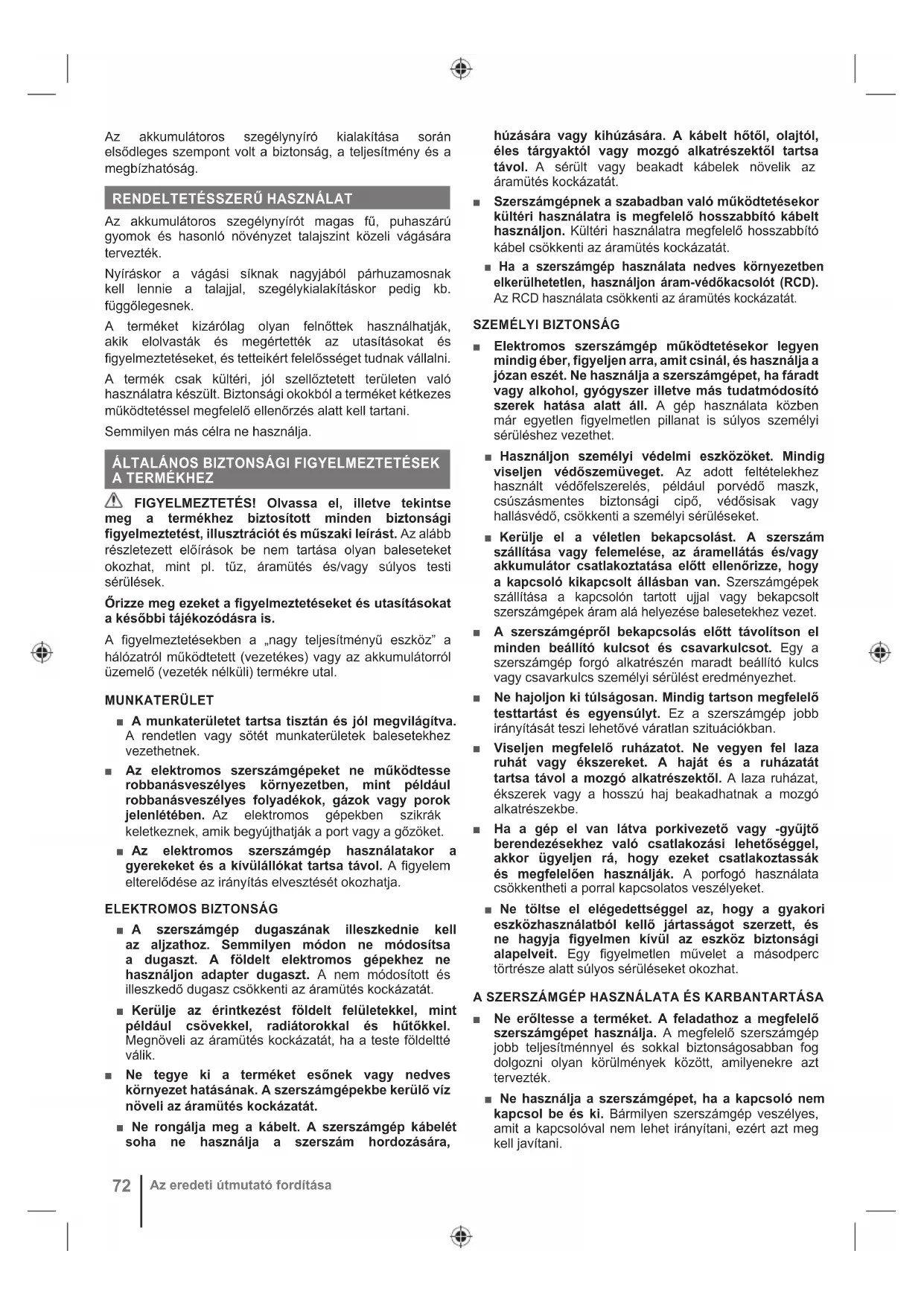 Poznámka Varování Díly nebo příslušenství jsou v prodeji samostatně72 Az eredeti útmutató fordítása Az akkumulátoros szegélynyíró kialakítása során elsődleges szempont volt a biztonság, a teljesítmény és a megbízhatóság.