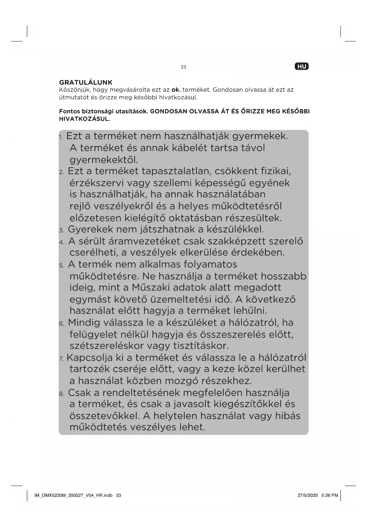 a terméket, és csak a javasolt kiegészítőkkel és összetevőkkel. A helytelen használat vagy hibás működtetés veszélyes lehet. IM_OMX5220M_200527_V04_HR.indb 33IM_OMX5220M_200527_V04_HR.indb 33 27/5/2020 5:26 PM27/5/2020 5:26 PMSize = A5