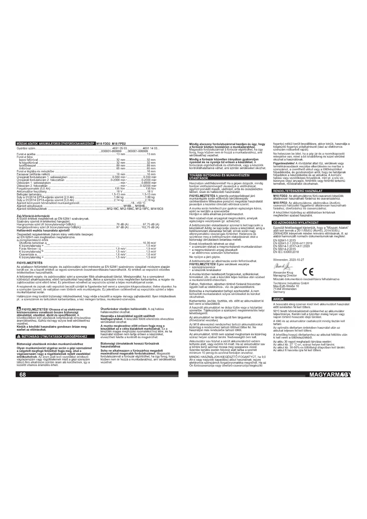 Egyedüli felelősséggel kijelentjük, hogy a "Műszaki Adatok” alatt leírt termék a 2011/65/EU (RoHS), 2014/30/EU, 2006/42/EK irányelvek minden releváns előírásának, ill. az alábbi harmonzált normatív dokumentumoknak megfelel: EN 62841-1:2015 EN 62841-2-1:2018+A11:2019 EN 55014-1:2017+A11:2020 EN 55014-2:2015 EN IEC 63000:2018 Winnenden, 2020-10-27 Alexander Krug Managing Director Műszaki dokumentáció összeállításra felhatalmazva Techtronic Industries GmbH Max-Eyth-Straße 10 71364 Winnenden Germany AKKUK A hosszabb ideig üzemen kívül lévő akkumulátort használat előtt ismételten fel kell tölteni. 50°C feletti hőrmérsékletnél csökkenhet az akkumulátor teljesítménye. Kerülni kell a túlzottan meleg helyen vagy napon történő hosszabb idejű tárolást. A töltő és az akkumulátor csatlakozóit mindig tisztán kell tartani. Az optimális élettartam érdekében használat után az akkukat teljesen fel kell tölteni. A lehetőleg hosszú élettartamhoz az akkukat feltöltés után ki kell venni a töltőkészülékből. Az akku 30 napot meghaladó tárolása esetén: Az akkut kb. 27 °C-on, száraz helyen kell tárolni. Az akkut kb. 30-50%-os töltöttségi állapotban kell tárolni. Az akkut 6 havonta újra fel kell tölteni. MAGYARMAGYAR MŰSZAKI ADATOK AKKUMULÁTOROS ÜTVEFÚRÓ/CSAVAROZÓGÉP Gyártási szám.......................................................................... Furat-ø acélba ......................................................................... Furat-ø fába lapos fafúróval ...................................................................... fa kígyófúróval ...................................................................... lyukfűrésszel ......................................................................... önfúróval ............................................................................... Furat-ø téglába és mészkőbe .................................................. Facsavar (előfúrás nélkül) ....................................................... Üresjárati fordulatszám 1. sebességben ................................. Üresjárati fordulatszám 2. fokozatban .................................... Ütésszám 1. sebességben ...................................................... Ütésszám 2. fokozatban .......................................................... Forgatónyomaték (5,0 Ah) ....................................................... Akkumulátor feszültség ........................................................... Befogási tartomány.................................................................. Súly a 01/2014 EPTA-eljárás szerint (2,0 Ah) ......................... Súly a 01/2014 EPTA-eljárás szerint (5,0 Ah) ......................... Ajánlott környezeti hőmérséklet munkavégzésnél................... Ajánlott akkutípusok ................................................................ Ajánlott töltőkészülékek ........................................................... Zaj-/Vibráció-információ A közölt értékek megfelelnek az EN 62841 szabványnak. Szabvány szerinti A-értékelésű hangszint: Hangnyomás szint (K bizonytalanság=3dB(A)) ....................... Hangteljesítmény szint (K bizonytalanság=3dB(A)) ................ Hallásvédő eszköz használata ajánlott! Összesített rezgésértékek (három irány vektoriális összege) az EN 62841-nek megfelelően meghatározva.
