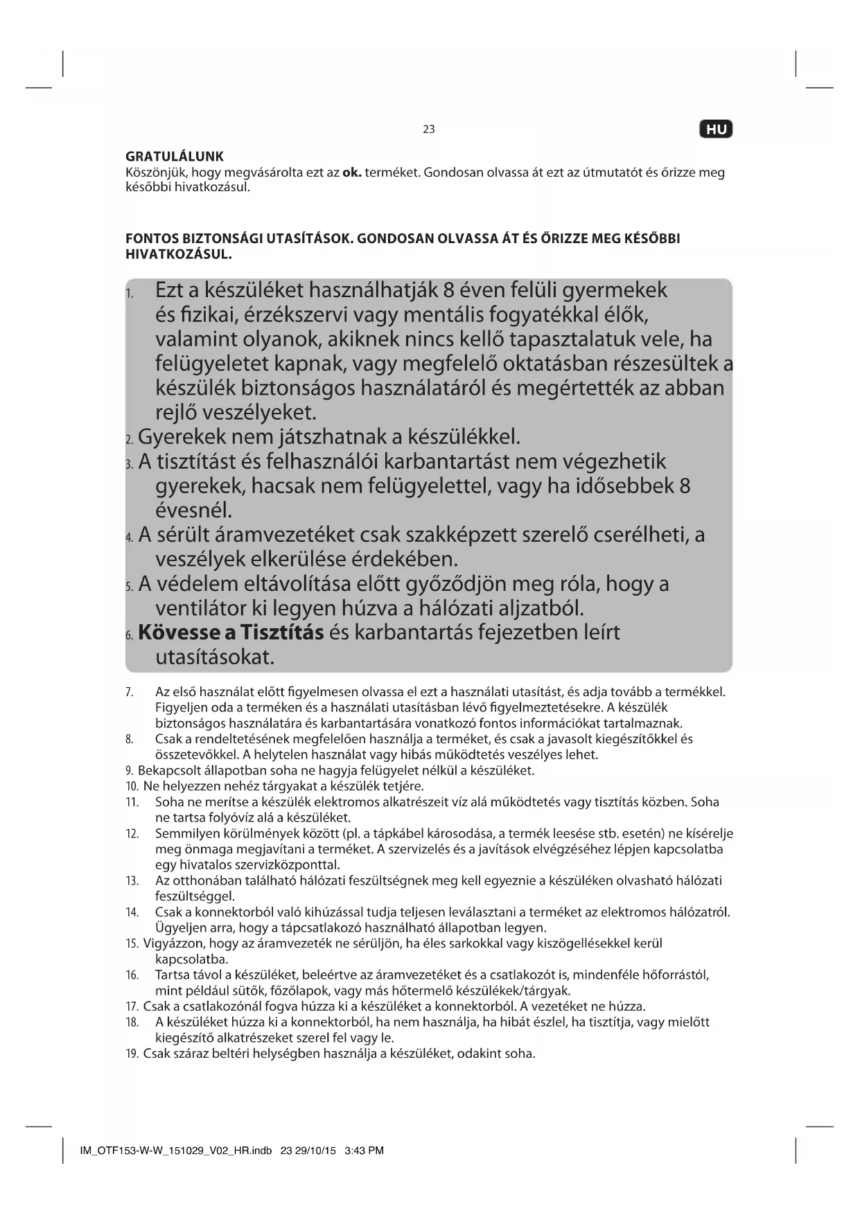 A termék kizárólag helyiségek levegőjének keringetésére szolgál. Csak az alábbi útmutatónak megfelelően használja. Ettől eltérő használata a termék károsodását vagy személyi sérülést okozhat. Az Imtron GmbH semmilyen felelősséget nem vállal a termék meghibásodásáért, anyagi károkért vagy személyi sérülésekért, amelyek a termék gyelmetlen, szakszerűtlen, helytelen vagy nem a gyártó által megadott célra történő használatára vezethetők vissza. IM_OTF153-W-W_151029_V02_HR.indb 24 29/10/15 3:43 PM25