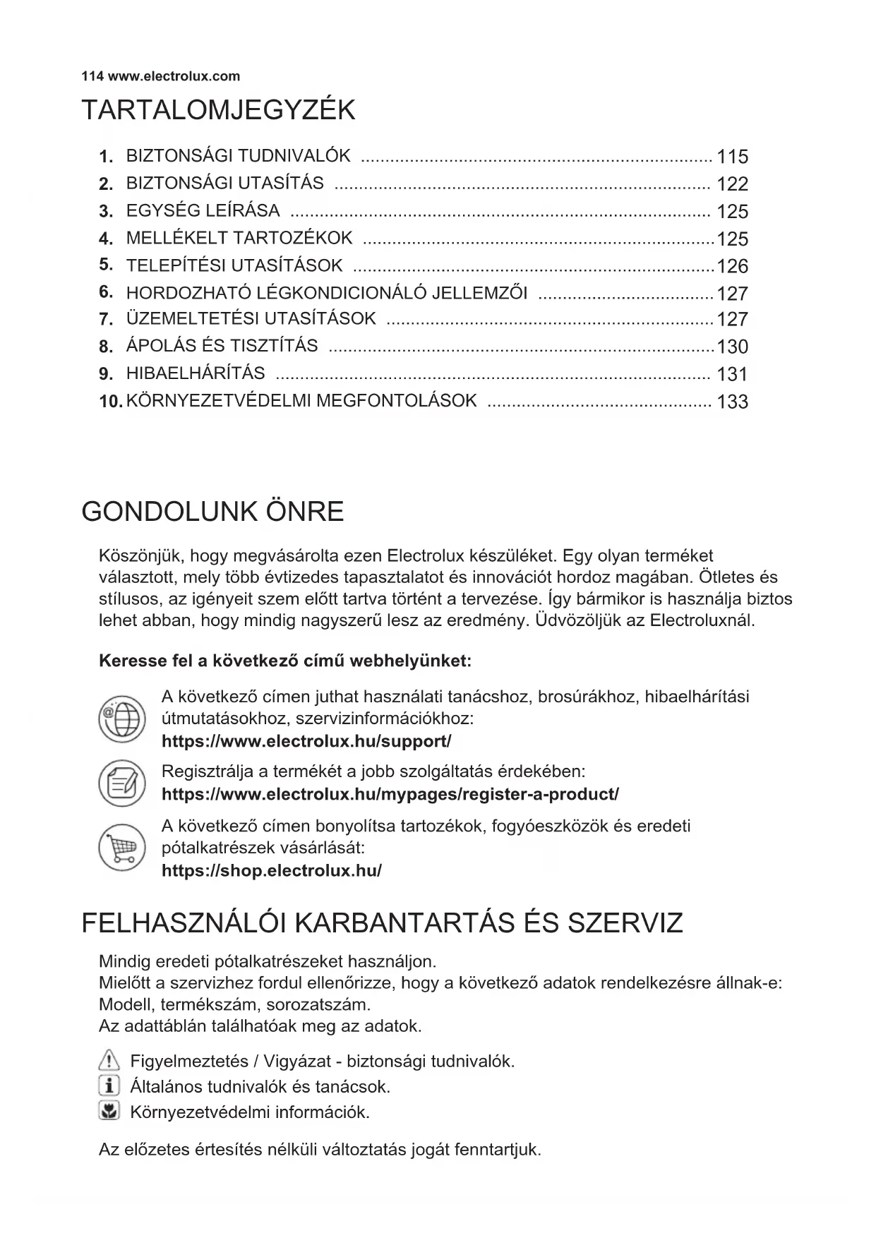 Reciklirajte materijale s ovim simbolom. Odložite pakiranje u odgovarajući spremnik i reciklirajte. Pomognite očuvati okoliš i zdravlje ljudi i reciklirajte otpad električnih i elektroničkih uređaja. Uređaje označene simbolom nemojte odlagati s kućnim otpadom. Vratite proizvod vašem lokalnom pogonu za recikliranje ili kontaktirajte komunalnu službu. Softver uređaja djelomično se temelji na besplatnom i softveru otvorenog koda. Za potpune informacije o autorskim pravima i primjenjivim uvjetima licence posjetite: https://emtech.delta.electrolux.com/license Za više informacija posjetite www.electrolux.com114 www.electrolux.com Az előzetes értesítés nélküli változtatás jogát fenntartjuk. GONDOLUNK ÖNRE FELHASZNÁLÓI KARBANTARTÁS ÉS SZERVIZ Köszönjük, hogy megvásárolta ezen Electrolux készüléket. Egy olyan terméket választott, mely több évtizedes tapasztalatot és innovációt hordoz magában. Ötletes és stílusos, az igényeit szem előtt tartva történt a tervezése. Így bármikor is használja biztos lehet abban, hogy mindig nagyszerű lesz az eredmény. Üdvözöljük az Electroluxnál. Mindig eredeti pótalkatrészeket használjon. Mielőtt a szervizhez fordul ellenőrizze, hogy a következő adatok rendelkezésre állnak-e: Modell, termékszám, sorozatszám. Az adattáblán találhatóak meg az adatok. Keresse fel a következő című webhelyünket: A következő címen juthat használati tanácshoz, brosúrákhoz, hibaelhárítási útmutatásokhoz, szervizinformációkhoz: https://www.electrolux.hu/support/ Regisztrálja a termékét a jobb szolgáltatás érdekében: https://www.electrolux.hu/mypages/register-a-product/ A következő címen bonyolítsa tartozékok, fogyóeszközök és eredeti pótalkatrészek vásárlását: https://shop.electrolux.hu/