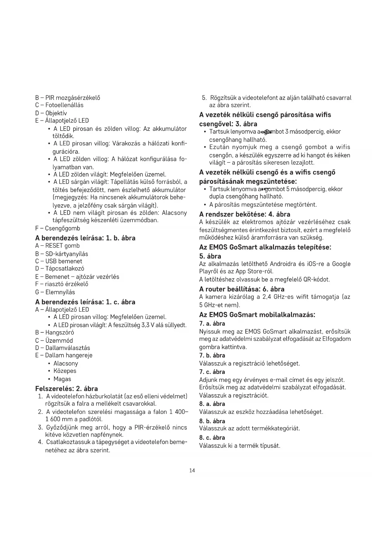 - A LED nem világít pirosan és zölden: Alacsony tápfeszültség készenléti üzemmódban. F – Csengőgomb A berendezés leírása: 1. b. ábra A – RESET gomb B – SD-kártyanyílás C – USB bemenet D – Tápcsatlakozó E – Bemenet – ajtózár vezérlés F – riasztó érzékelő G – Elemnyílás A berendezés leírása: 1. c. ábra A – Állapotjelző LED