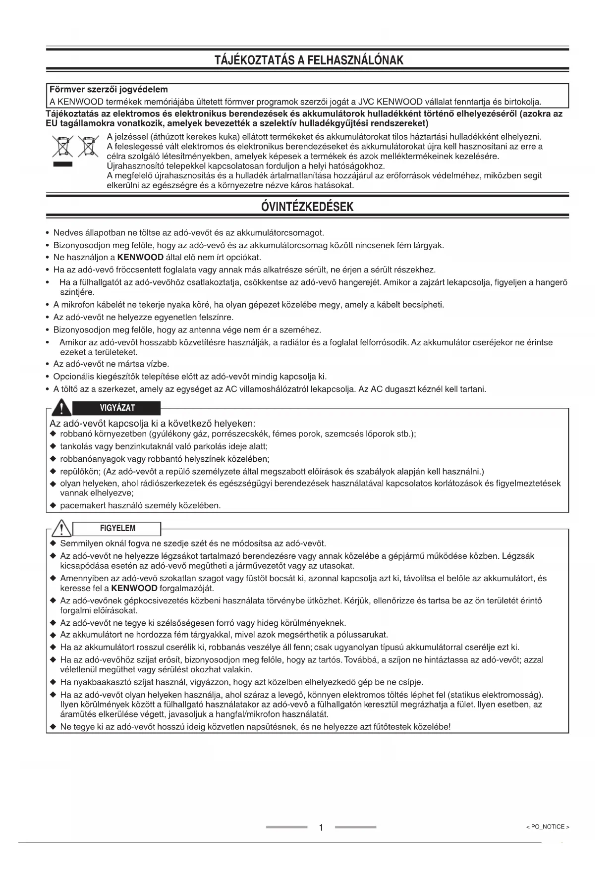 TÁJÉKOZTATÁS A FELHASZNÁLÓNAK Förmver szerzői jogvédelem A KENWOOD termékek memóriájába ültetett förmver programok szerzői jogát a JVC KENWOOD vállalat fenntartja és birtokolja. Tájékoztatás az elektromos és elektronikus berendezések és akkumulátorok hulladékként történő elhelyezéséről (azokra az EU tagállamokra vonatkozik, amelyek bevezették a szelektív hulladékgyűjtési rendszereket) A jelzéssel (áthúzott kerekes kuka) ellátott termékeket és akkumulátorokat tilos háztartási hulladékként elhelyezni. A feleslegessé vált elektromos és elektronikus berendezéseket és akkumulátorokat újra kell hasznosítani az erre a célra szolgáló létesítményekben, amelyek képesek a termékek és azok melléktermékeinek kezelésére. Újrahasznosító telepekkel kapcsolatosan forduljon a helyi hatóságokhoz. A megfelelő újrahasznosítás és a hulladék ártalmatlanítása hozzájárul az erőforrások védelméhez, miközben segít elkerülni az egészségre és a környezetre nézve káros hatásokat.