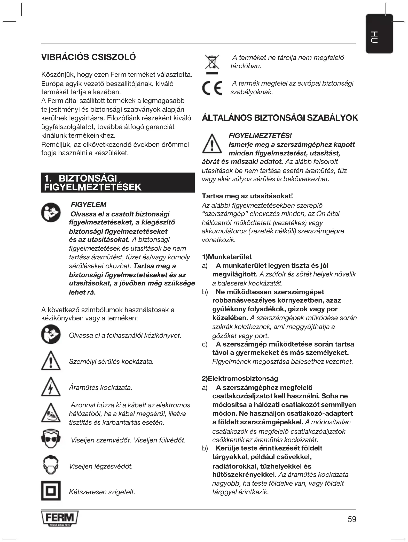 FIGYELMEZTETÉSEK FIGYELEM Olvassa el a csatolt biztonsági figyelmeztetéseket, a kiegészítő biztonsági figyelmeztetéseket és az utasításokat. A biztonsági figyelmeztetések és utasítások be nem tartása áramütést, tüzet és/vagy komoly sérüléseket okozhat. Tartsa meg a biztonsági figyelmeztetéseket és az utasításokat, a jövőben még szüksége lehet rá. A következő szimbólumok használatosak a kézikönyvben vagy a terméken: Olvassa el a felhasználói kézikönyvet. Személyi sérülés kockázata. Áramütés kockázata. Azonnal húzza ki a kábelt az elektromos hálózatból, ha a kábel megsérül, illetve tisztítás és karbantartás esetén. Viseljen szemvédőt. Viseljen fülvédőt. Viseljen légzésvédőt. Kétszeresen szigetelt. A terméket ne tárolja nem megfelelő tárolóban. A termék megfelel az európai biztonsági szabályoknak.