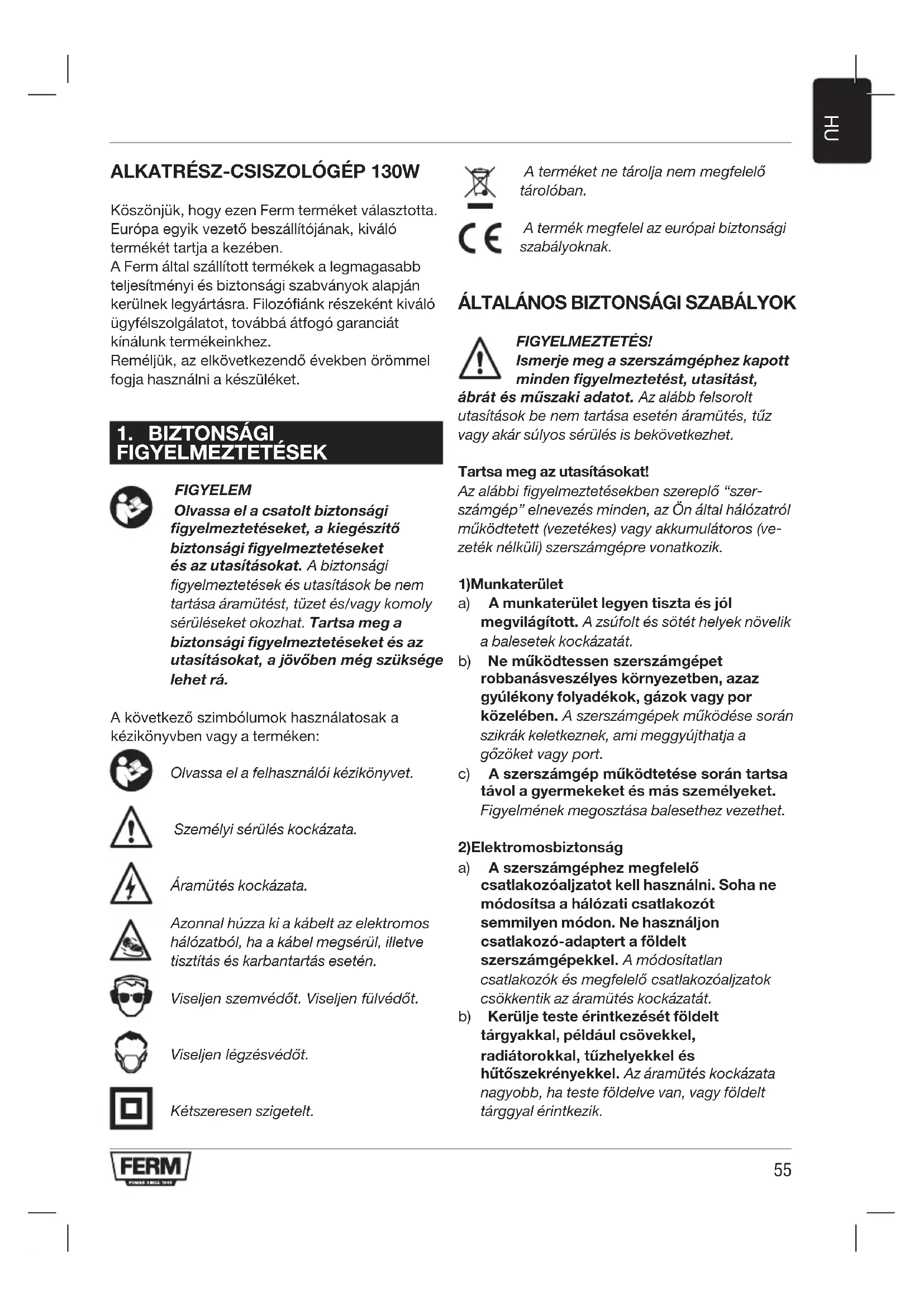 Köszönjük, hogy ezen Ferm terméket választotta. Európa egyik vezető beszállítójának, kiváló termékét tartja a kezében. A Ferm által szállított termékek a legmagasabb teljesítményi és biztonsági szabványok alapján kerülnek legyártásra. Filozófiánk részeként kiváló ügyfélszolgálatot, továbbá átfogó garanciát kínálunk termékeinkhez. Reméljük, az elkövetkezendő években örömmel fogja használni a készüléket.